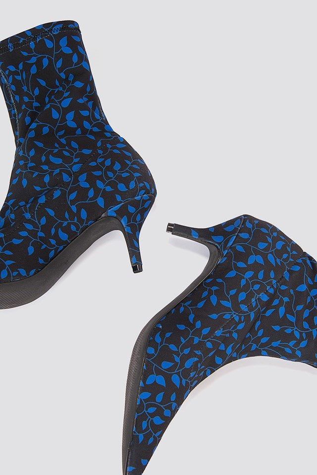 Black Sock Booties Floral Print Kitten Heel Ankle Boots