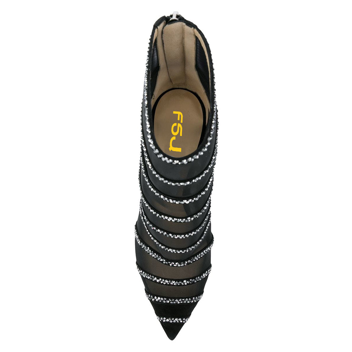 Black Mesh Ankle Boots Pointed Toe Rhinestone Stiletto Heel Booties