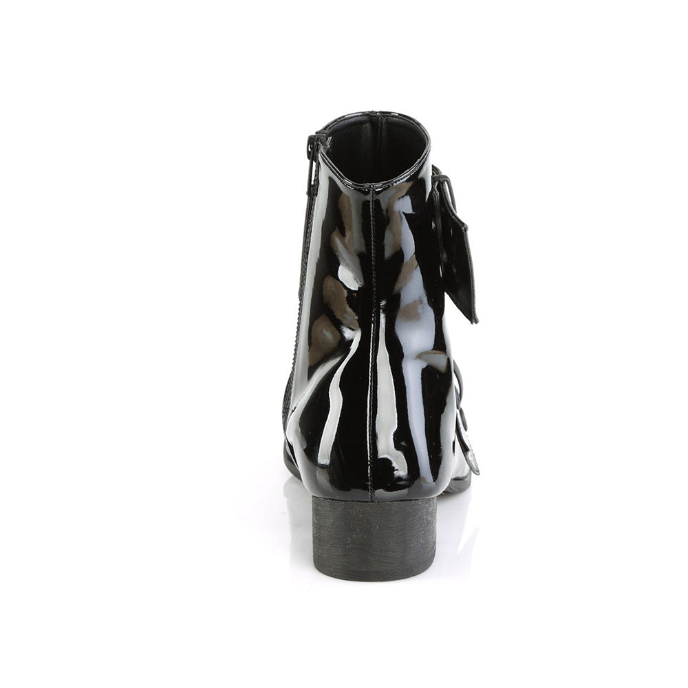 - Special Designs: Black patent leather ankle boots with studded strappy design and side-zip closure._ __
