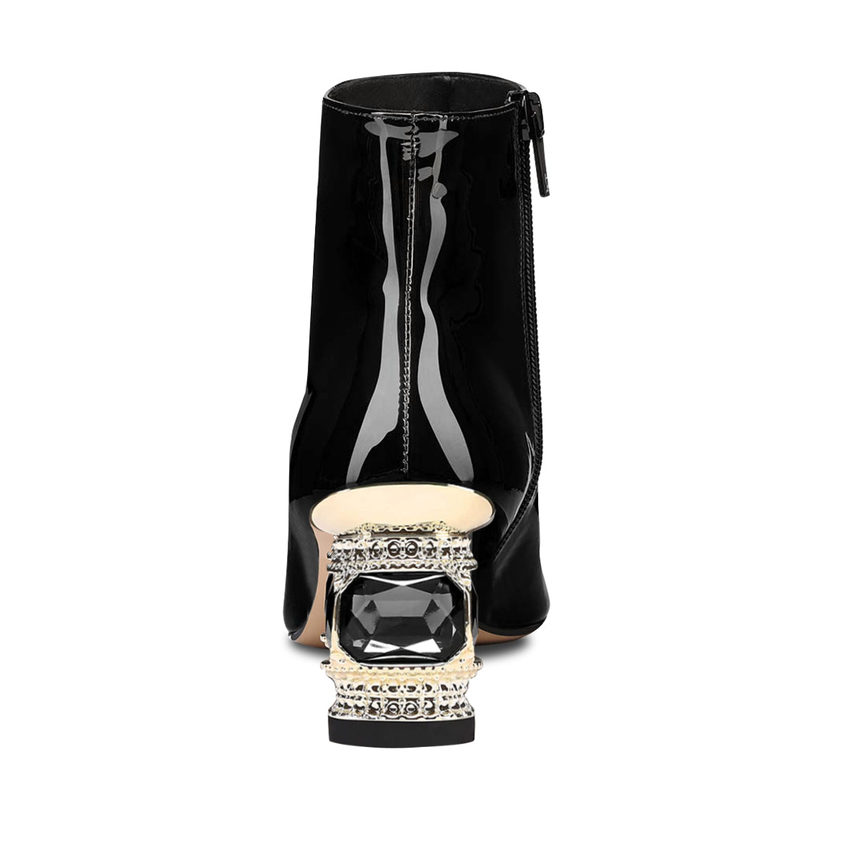 - Special Designs: Black ankle boots with side-zip closure and a rhinestone embellished heel._ _ _ _ _ _ _ _ _ _ _ _ _ _ _ _ _ _ _ __