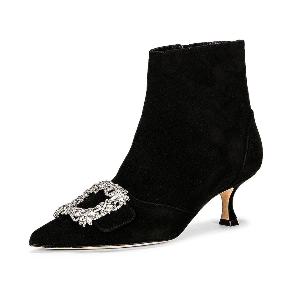 - Special Designs: The black ankle boots feature a rhinestone buckle accent with a kitten heel.