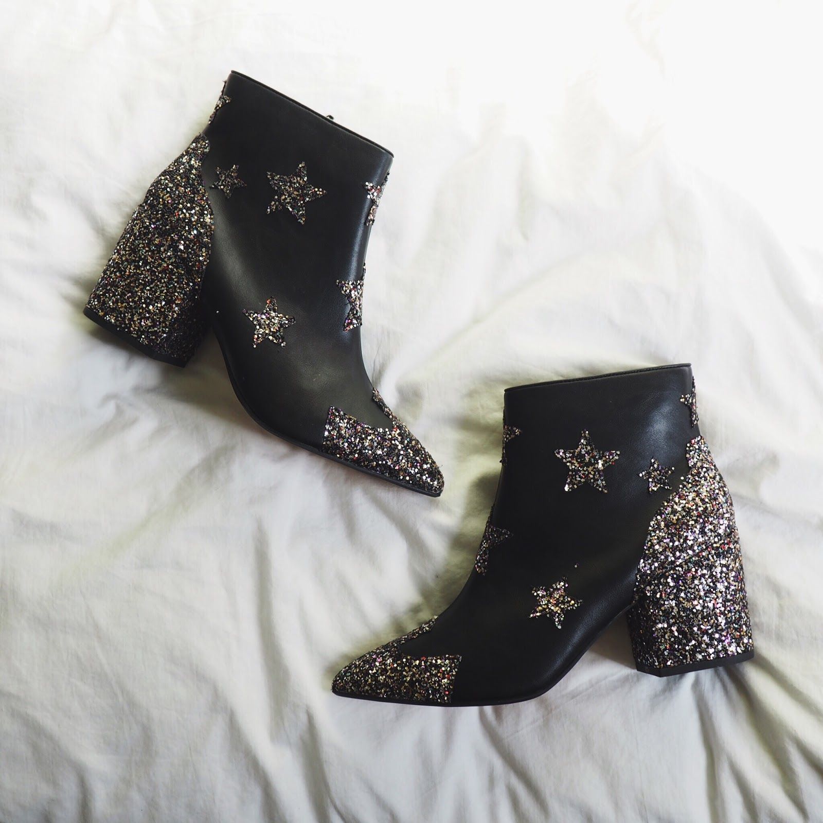 Black Almond Toe Glitter Patchwork Star Ankle Boots with Block Heel