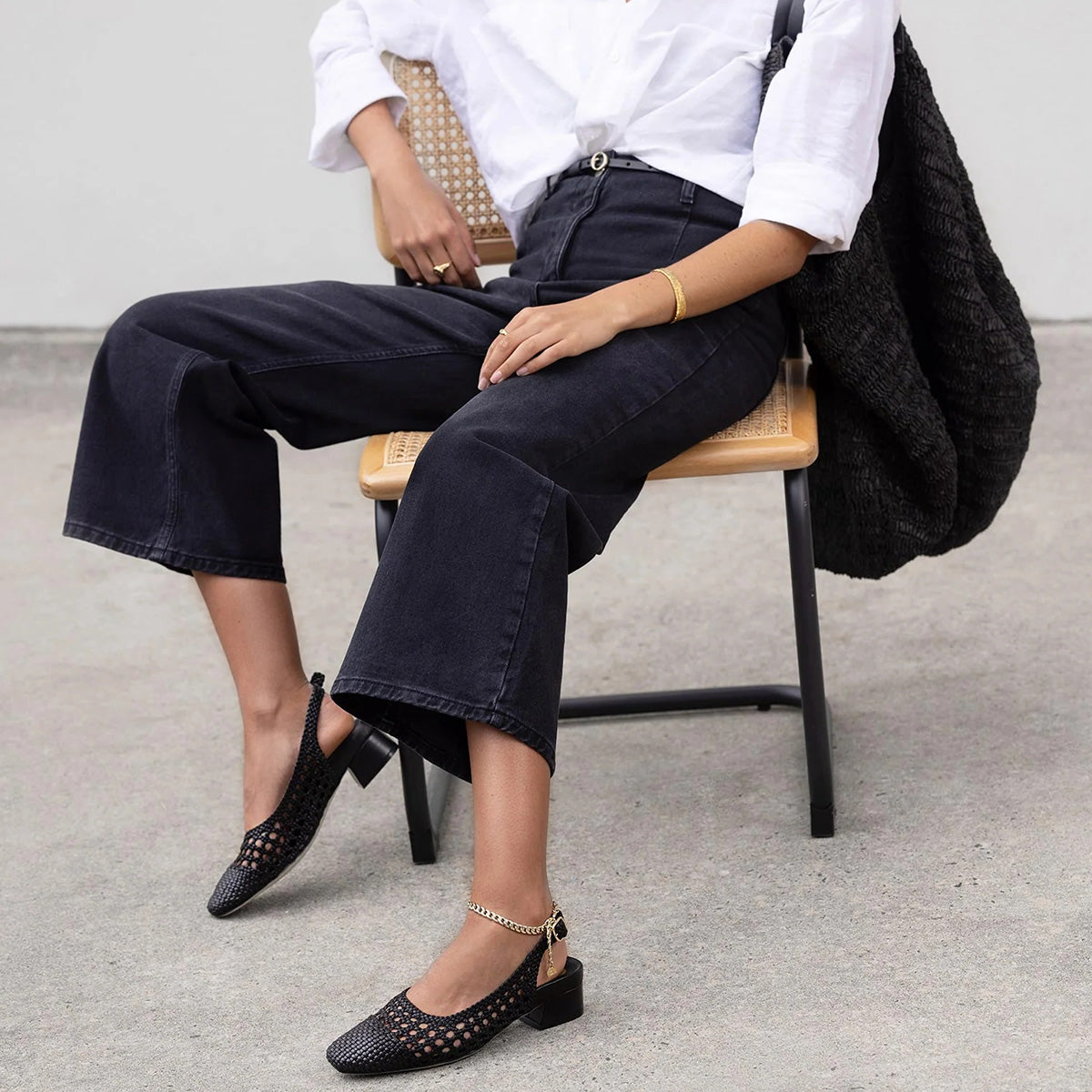 - Special Designs: Black slingback shoes feature woven and cut-out designs and a low block heel.