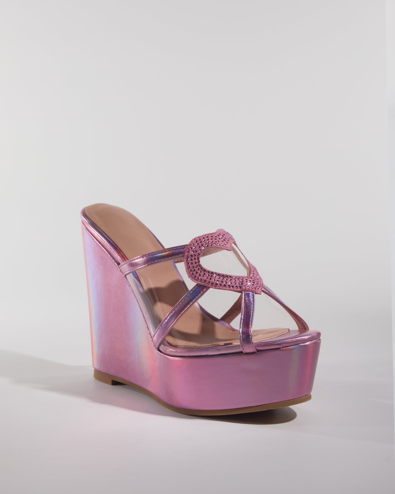 Step into glamour with our Brielle Rhinestone Heart Wedge Mules. These eye-catching shoes feature sparkling rhinestone heart accents that catch the light with every step. The comfortable wedge heel provides height without sacrificing stability, making them perfect for special occasions or adding a touch of luxury to everyday outfits. Don't just walk—make a statement with every step.