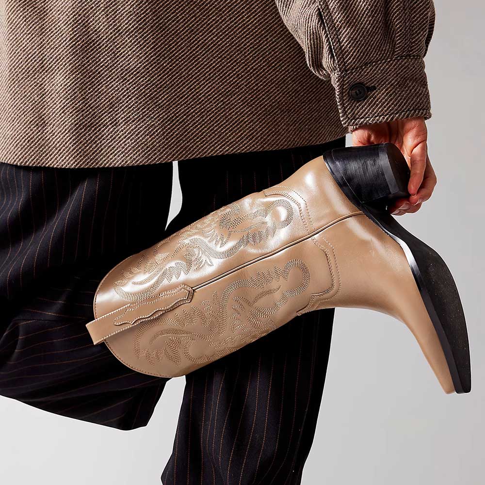 Classic Brown Embroidered Chunky Heel Mid-Calf Cowboy Boots for Women