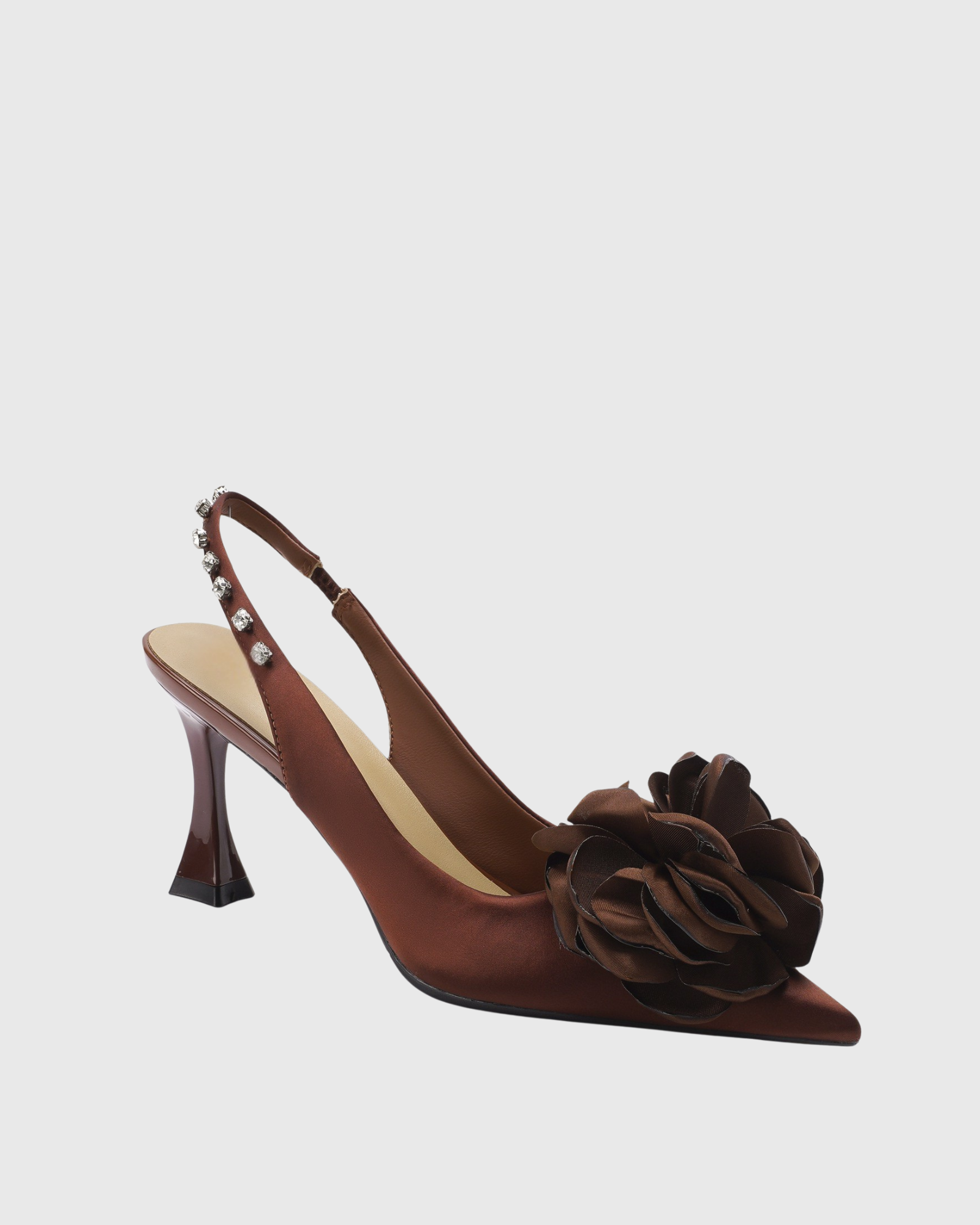 Clio Satin Flower Rhinestone Slingback Pumps In Brown