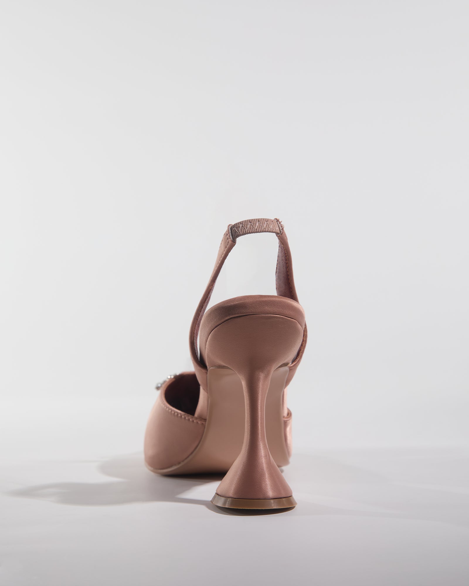 Fedora Crystal Bow Satin Slingback Flared Heels In Champagne