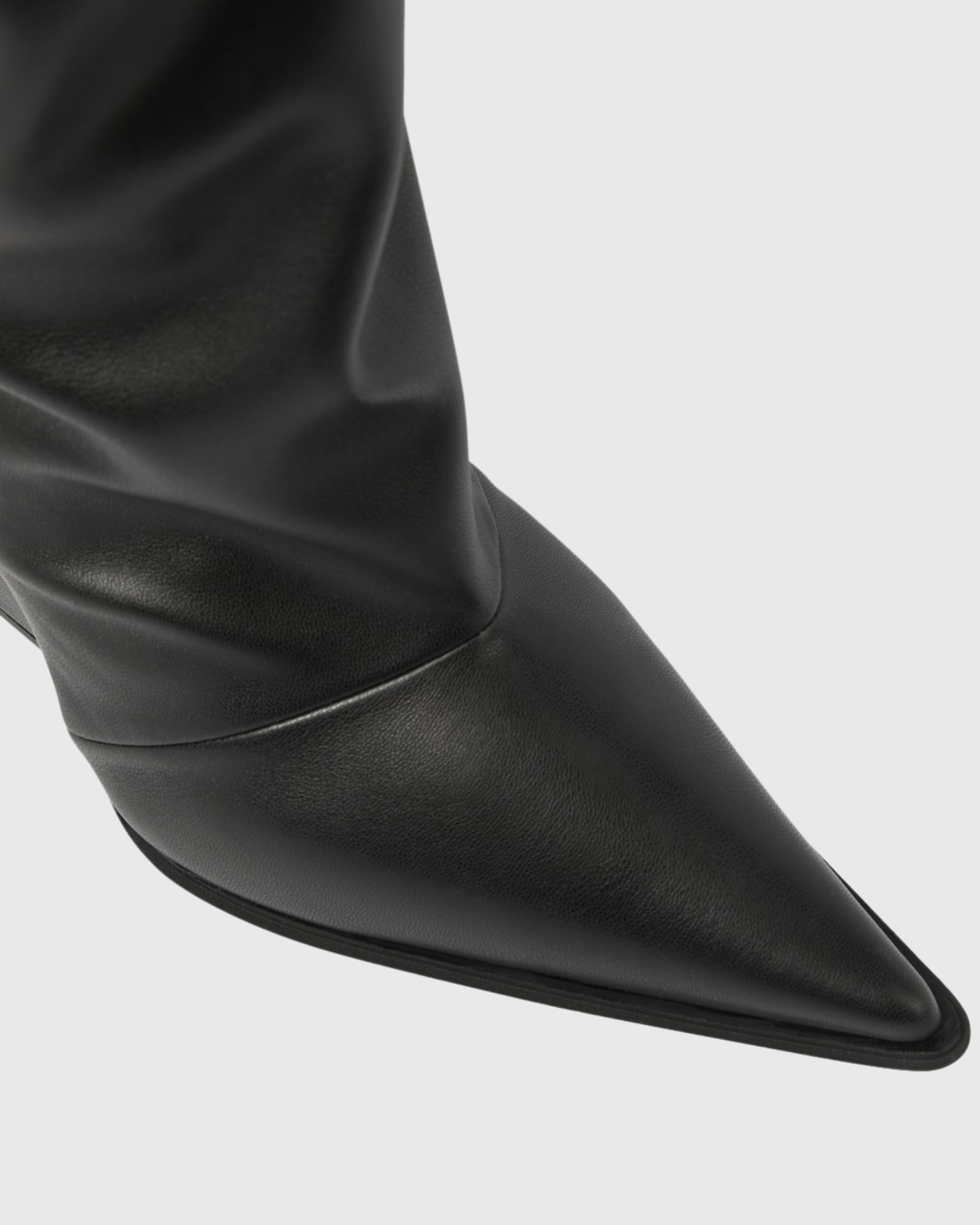 Elevate your wardrobe with the Gaia Ruched Leather Knee High Boots in Black—a timeless essential that seamlessly transitions from day to night. Crafted from premium leather, these boots feature distinctive ruching details that add sophisticated texture and visual interest to any outfit. The knee-high silhouette provides versatile styling options, whether paired with dresses, skirts, or tailored trousers. Designed for both comfort and confidence, these boots deliver the polished elegance you've been searching for. Make a statement with footwear that combines classic style with contemporary flair.