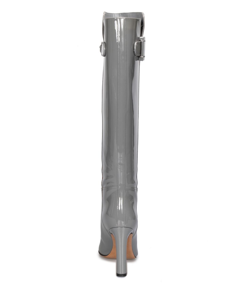 Grey Patent Leather Square Toe Knee High Boots with Block Heels
