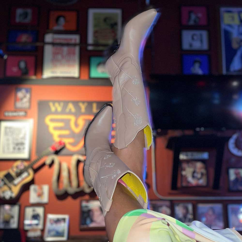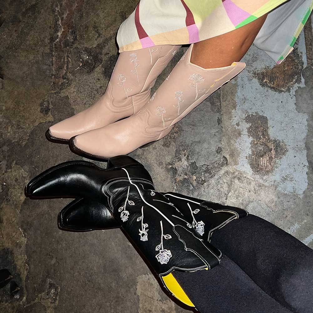 Nude Rose Embroidered Chunky Heel Mid-Calf Cowboy Boots for Women