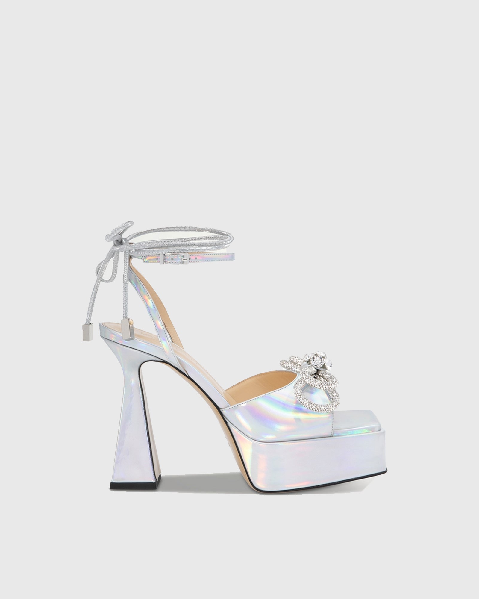 Rina Crystal Bow Lace Up Platform Flared Heels In Silver