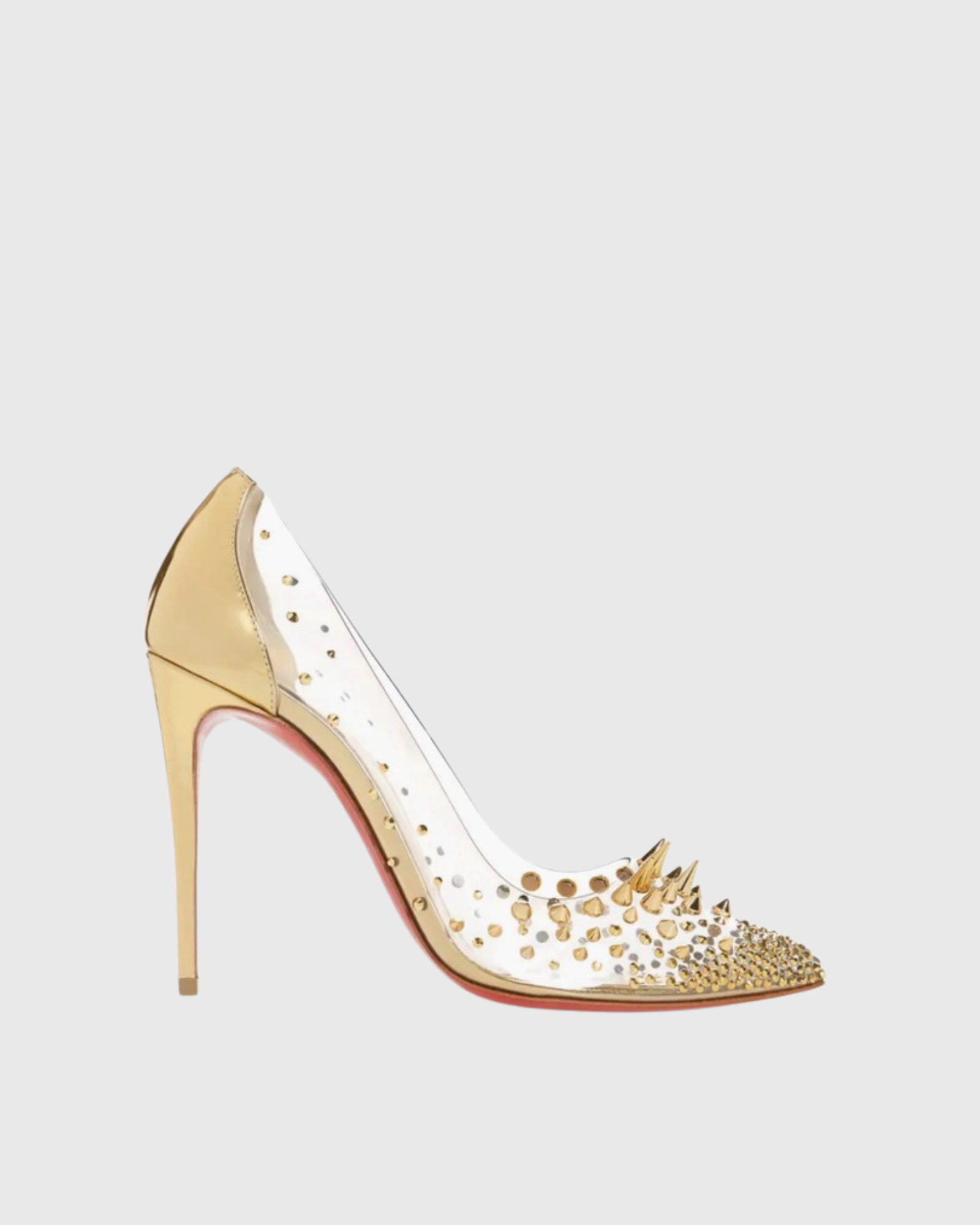 Introducing the Shani Rivet Embellished Pvc Pumps in Gold - the perfect combination of style and comfort! Made with high-quality materials, these pumps feature stunning rivet embellishments that add a touch of glamour to any outfit. Elevate your fashion game and turn heads with these statement-making pumps!