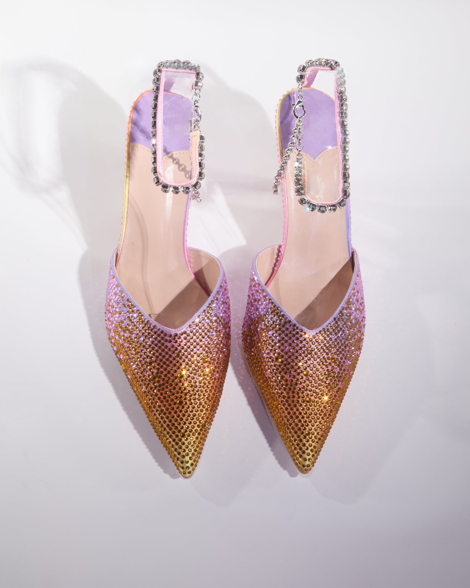 Elevate any outfit with our stunning Silva Rhinestone Embellished Pumps In Gradient Color! These pumps feature a gorgeous gradient color design, adorned with sparkling rhinestones. They not only add a touch of glamour, but also provide comfort with their perfect fit. Make a statement and turn heads wherever you go!