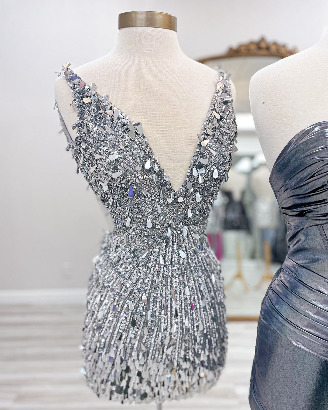 Silver V-neck Mini Party Dress Dance Homecoming Dress, AST1386