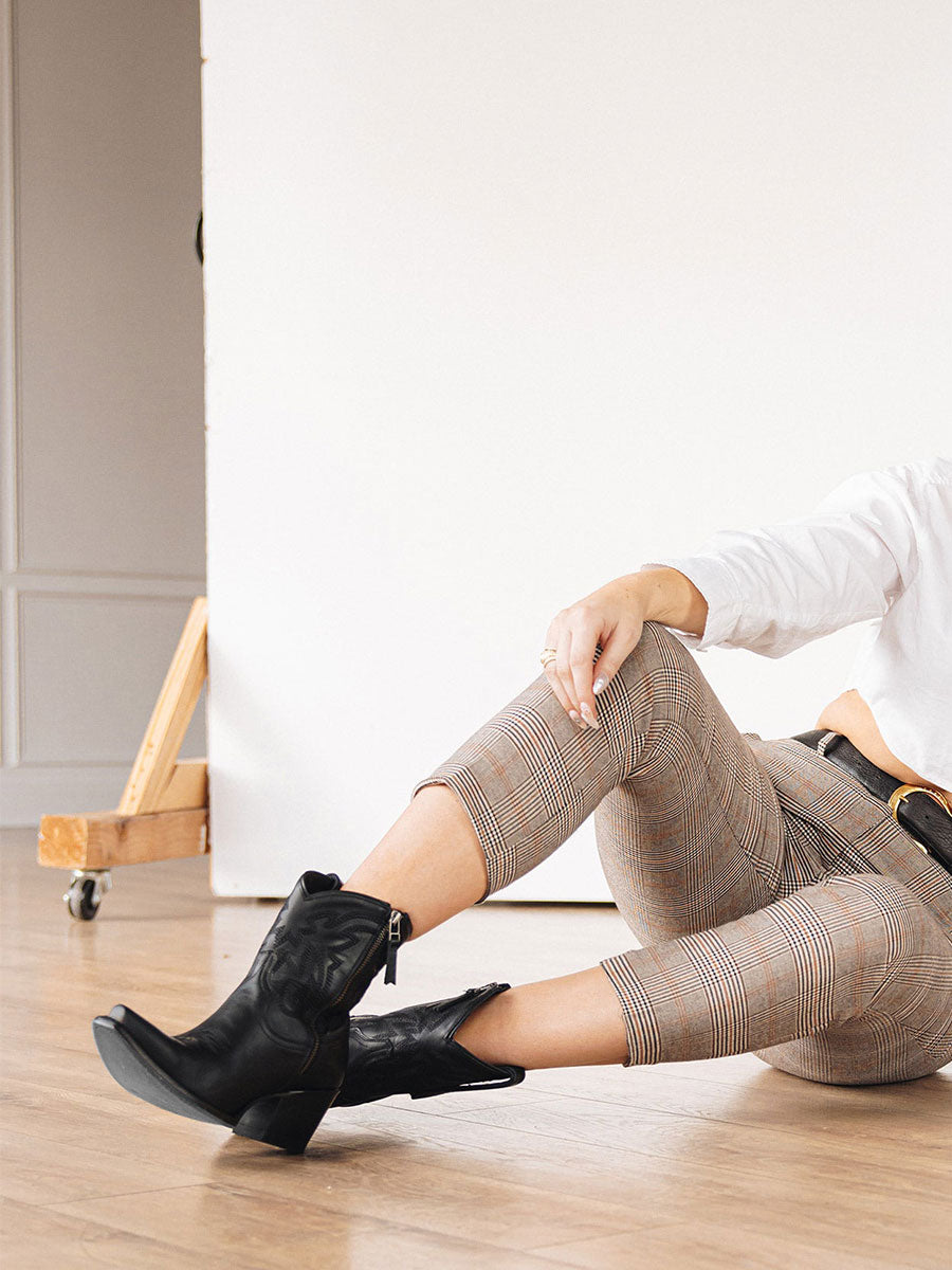 Black Snip Toe Embroidered Cowgirl Ankle Boots with Block Heel