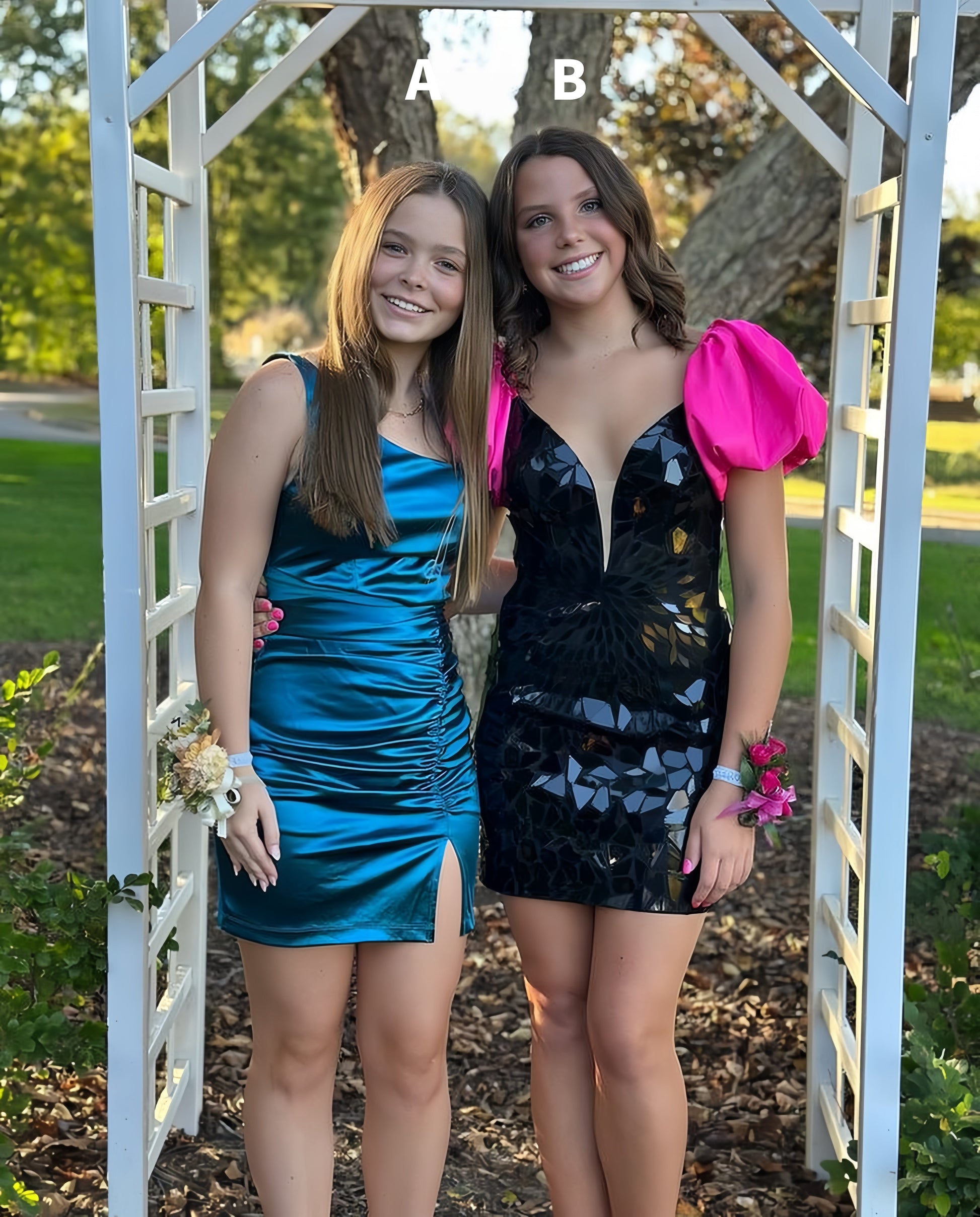 Style B, Black Mirror Sequined Tight Homecoming With Fuchsia Bubble Sleeves, AST1472