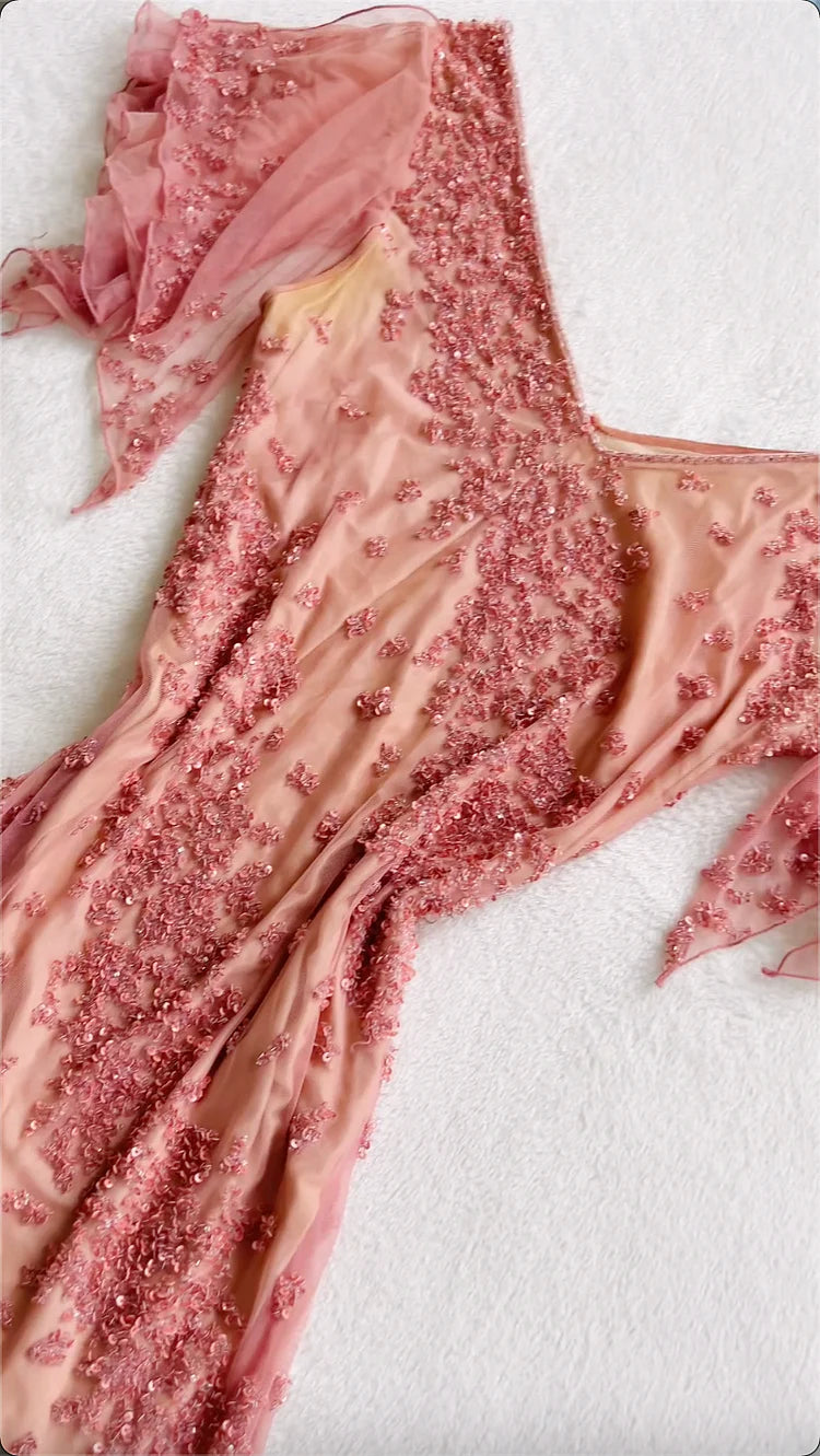 Vintage Pink Chiffon Sequin Prom Dress Sheath Off-the-shoulder Evening Dress Long Formal Dress TP4690