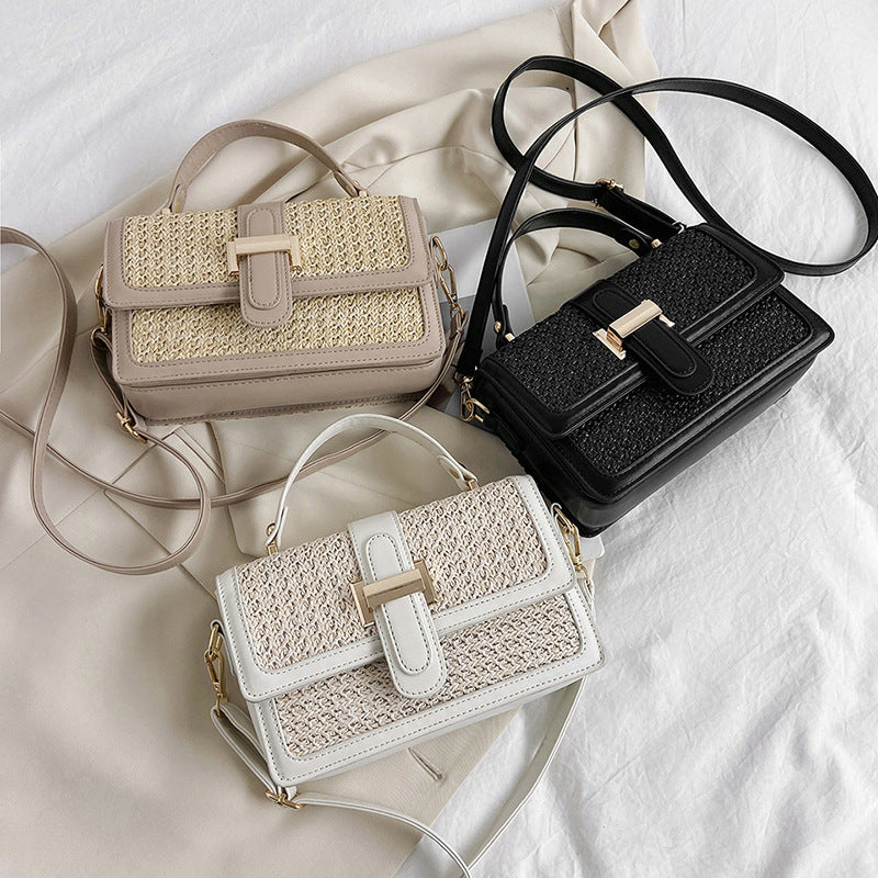 Sac à bandoulière en paille tissée de couleur unie pour femme, à rabat et poignée carrée