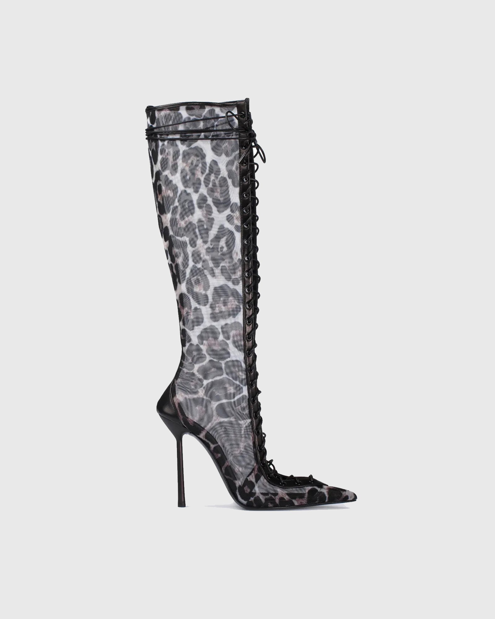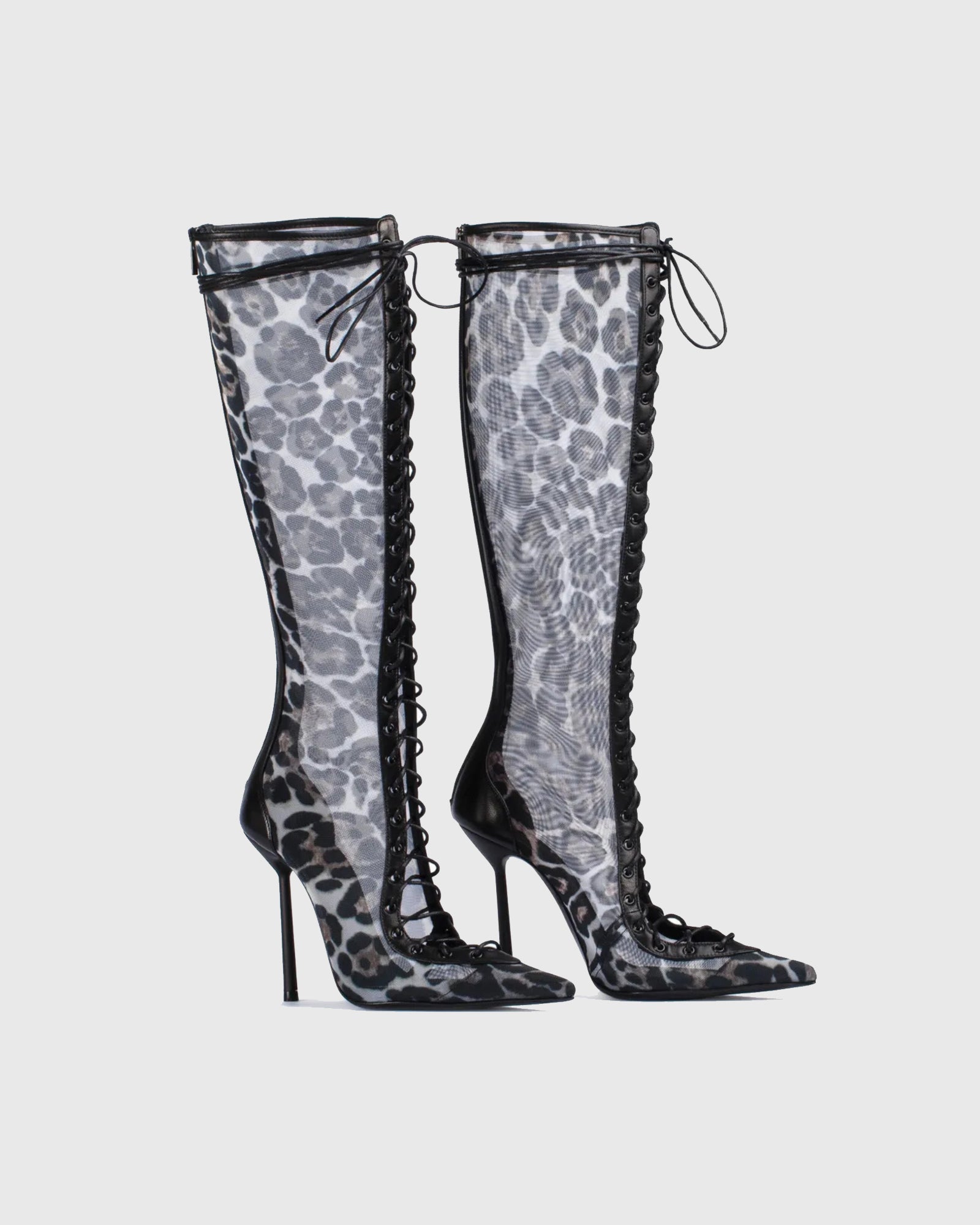 Agnola Leopard Print Mesh Lace Up Knee High Boots