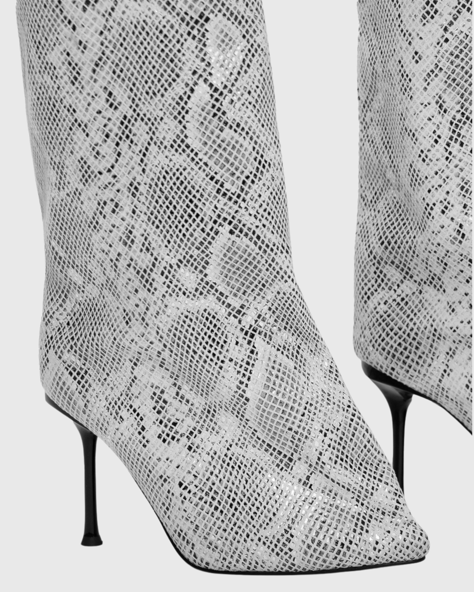 Make a bold fashion statement with the Angiola Slash Flare Knee High Boots in Snake. These boots feature eye-catching snake print leather and a distinctive flare silhouette that accentuates your legs while adding a touch of fierce elegance. Designed for both style and comfort, they are perfect for turning heads whether you're headed to a night out or elevating your everyday wardrobe. Embrace confidence and daring sophistication with every step.