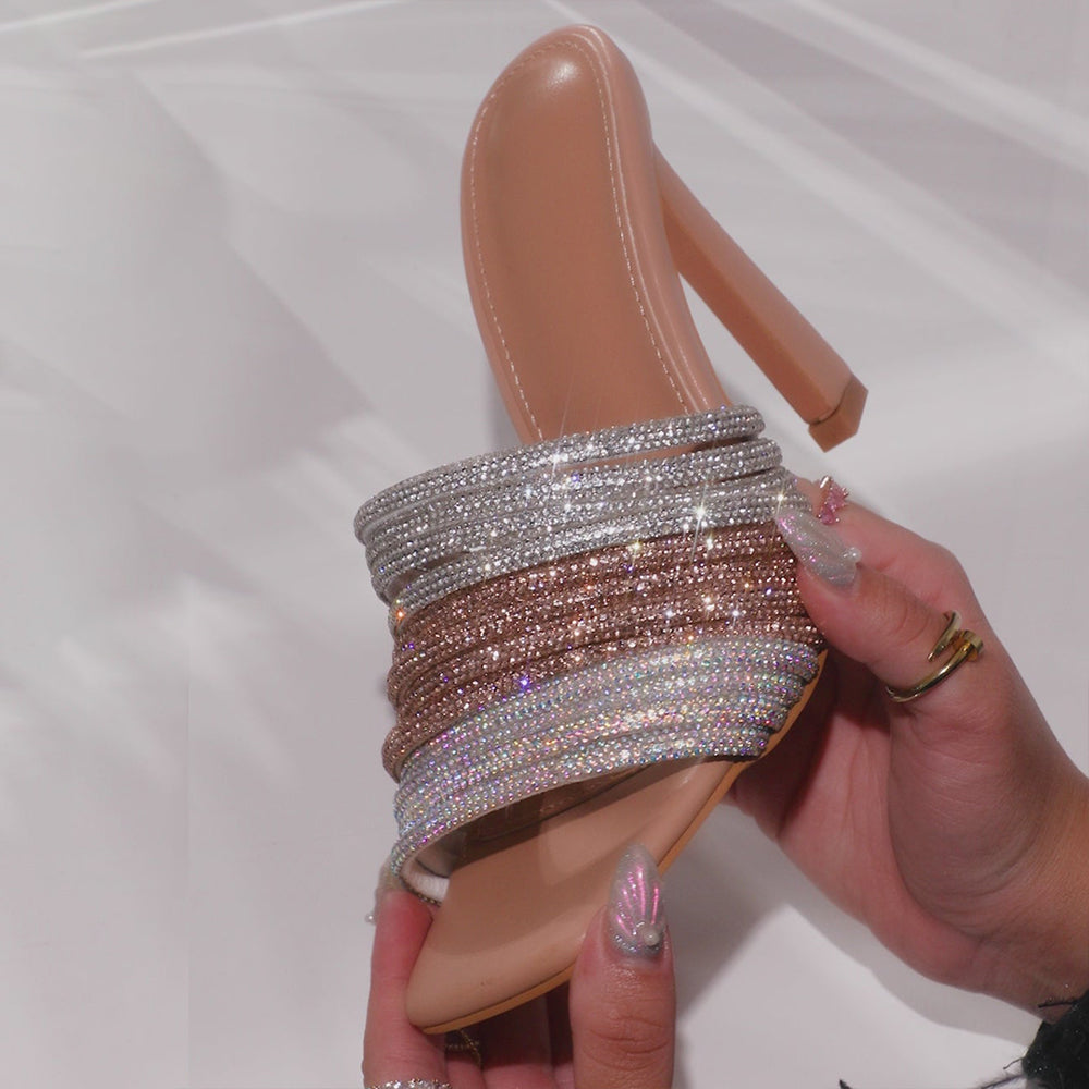 Beige Square Toe 3'' Stiletto Heel Rhinestone Strappy Mules