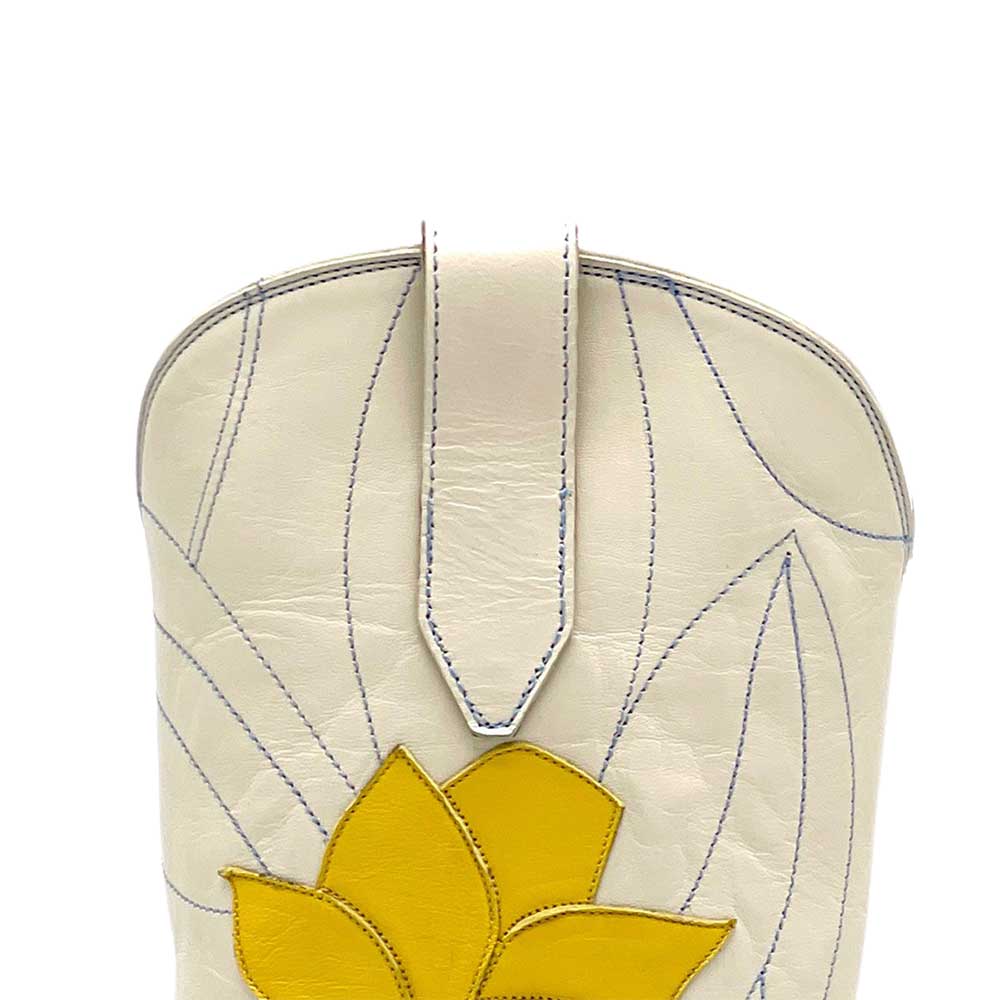 Elevate your style with these chic beige pointed toe boots featuring yellow floral stitching, a chunky heel, and knee-high design. Perfect for adding a touch of flair to any outfit.