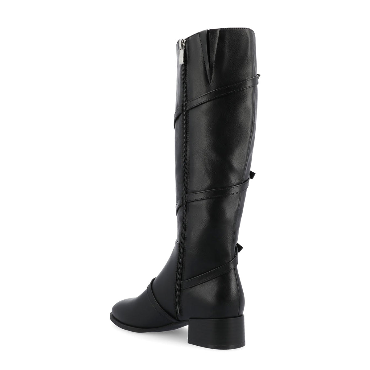 Black Buckle Strappy Round Toe Block Heel Knee High Boots for Women