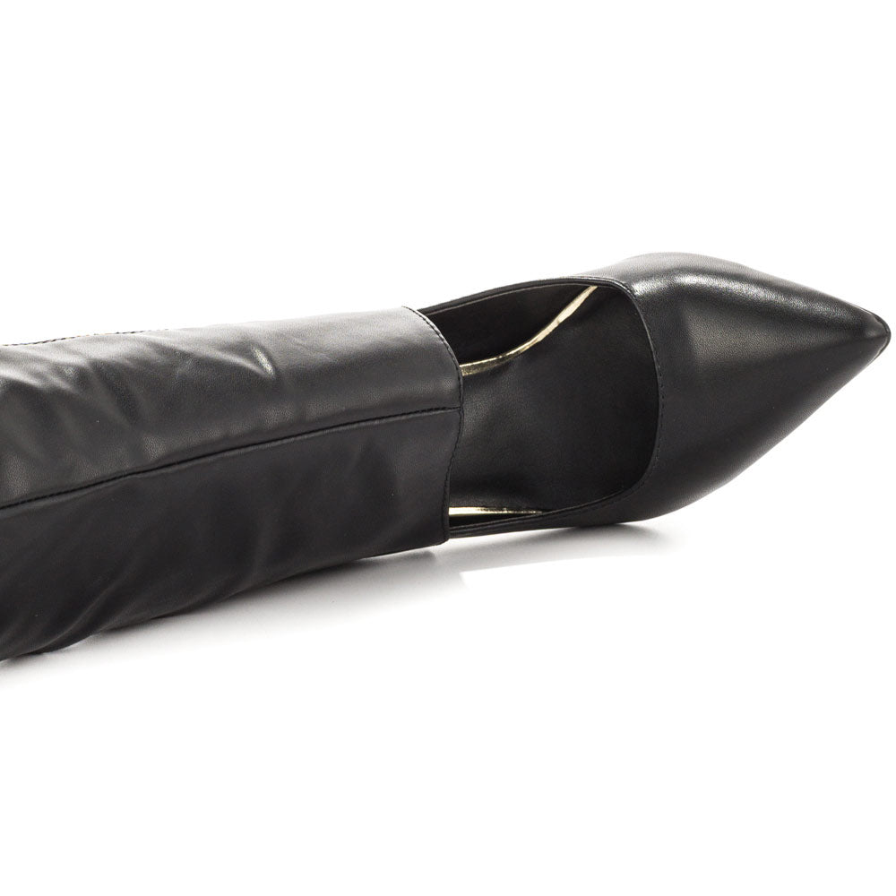 Elevate your style with our black pointed-toe stiletto-heel knee-high boots. Featuring a gold chain embellishment and a sexy cut-out design, these boots blend fashion and edge effortlessly.