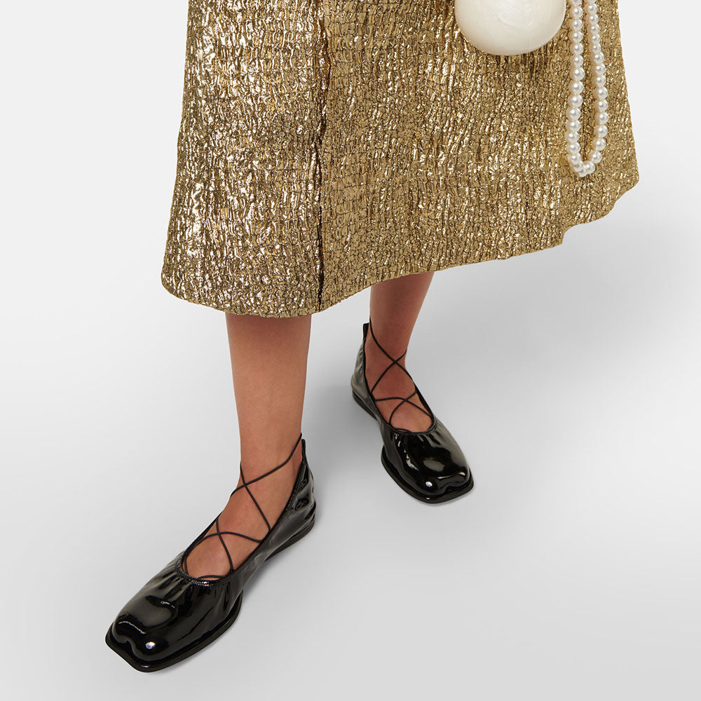 Stylish and versatile, these black patent leather square toe ballet flats feature elasticated edges and lace-up details, offering a modern twist to a classic footwear staple.