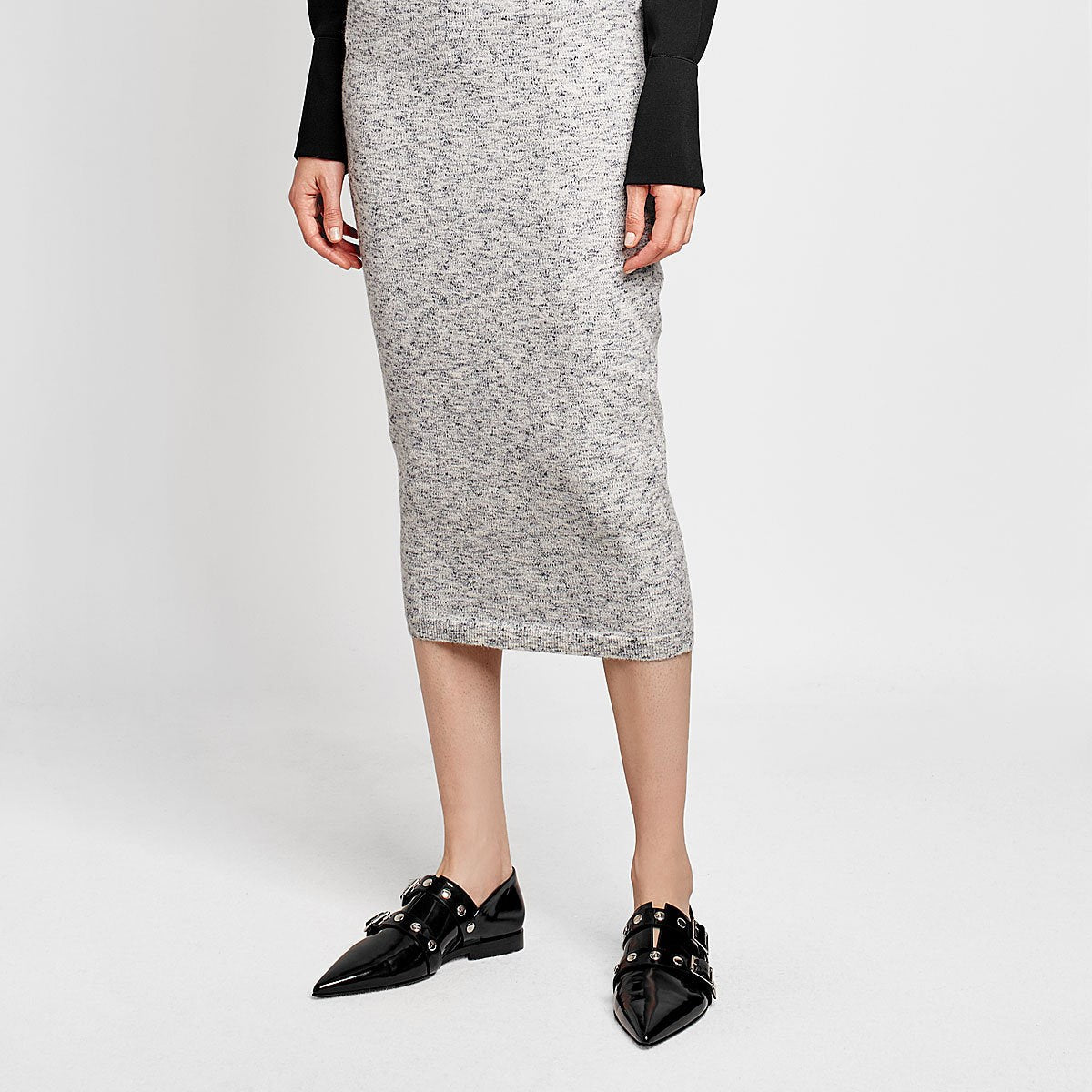 Black Patent Leather Pointed-Toe Buckle Strap Flats with Studs