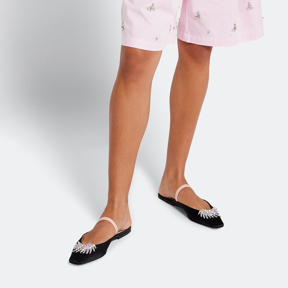 Black Satin Square Toe Rhinestone Embellished Mule Flats with Strap