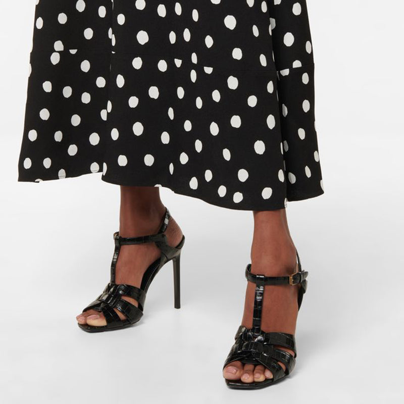 Square Toe Croco Embossed T-Strap Heels Buckle Black Sandals for Women