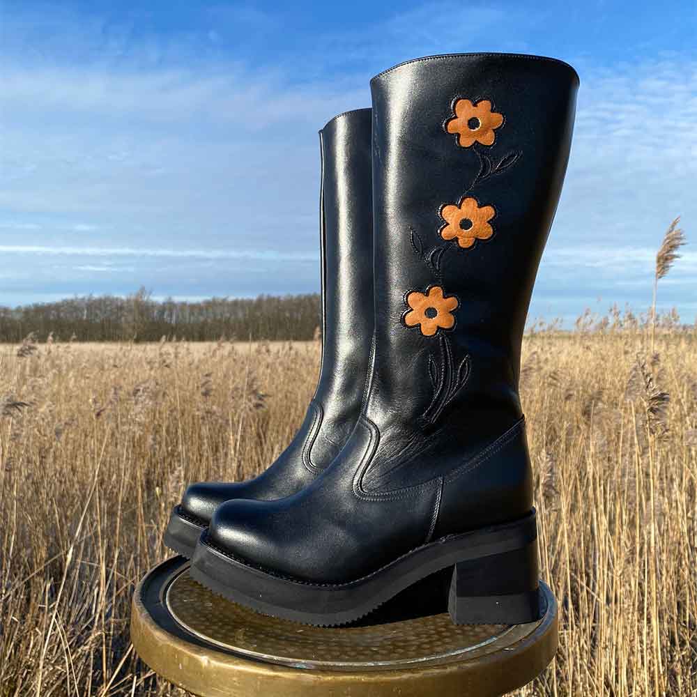 Black Square Toe Flower Inlay Chunky Heel Platform Mid Calf Boots