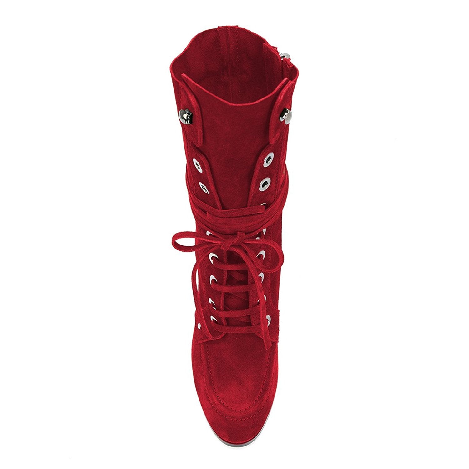 Red Vegan Suede Lace Up Round Toe Chunky Heel Mid Calf Boots