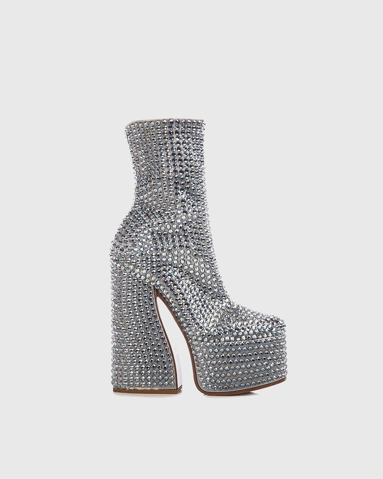 Cecilia Rhinestone Embellished Platform Mid Calf Boots In Silver
