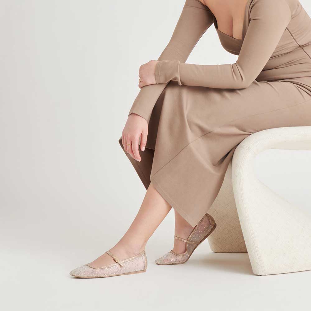 Champagne Rhinestone Embellished Mesh Square Toe Women's Dress Flats