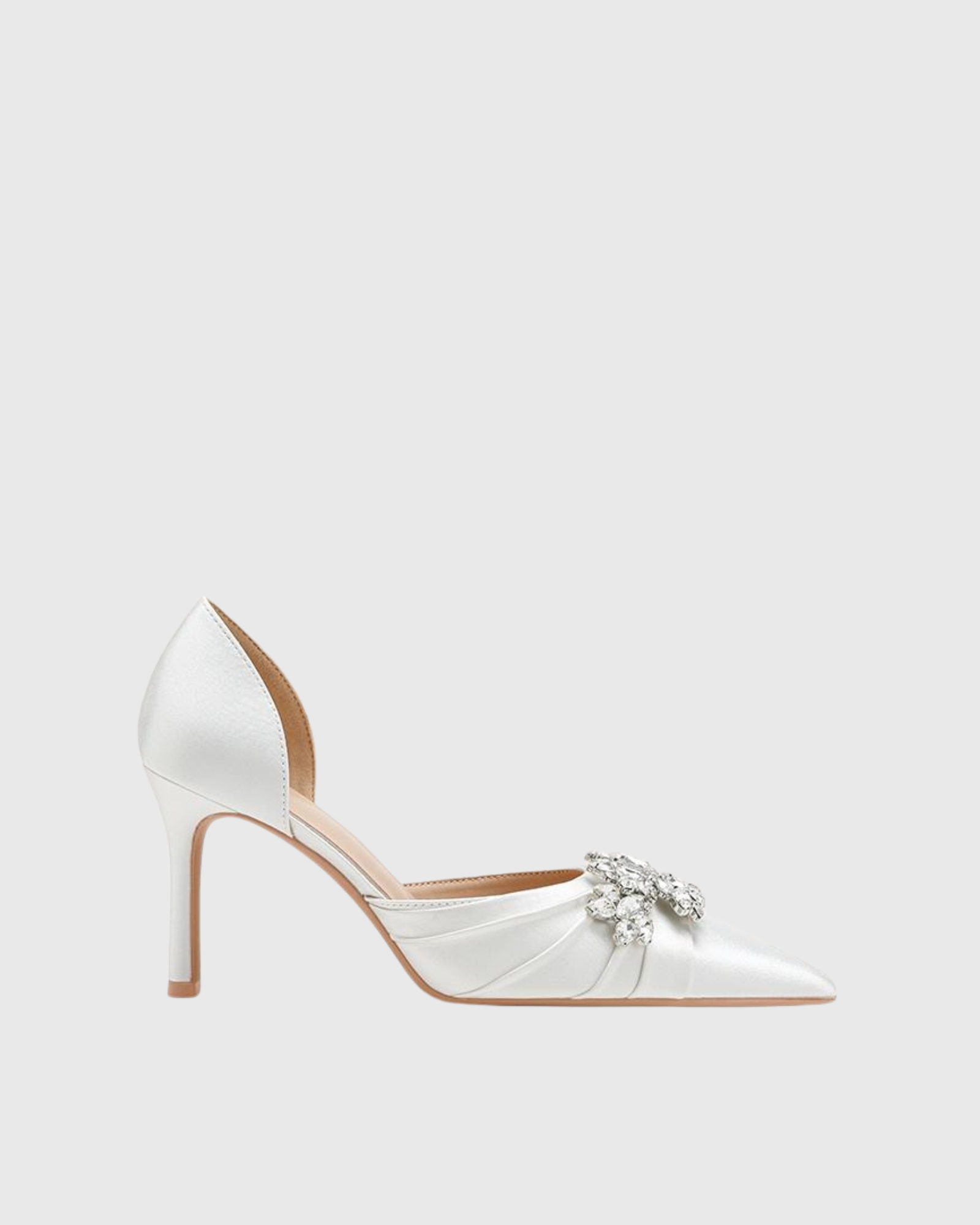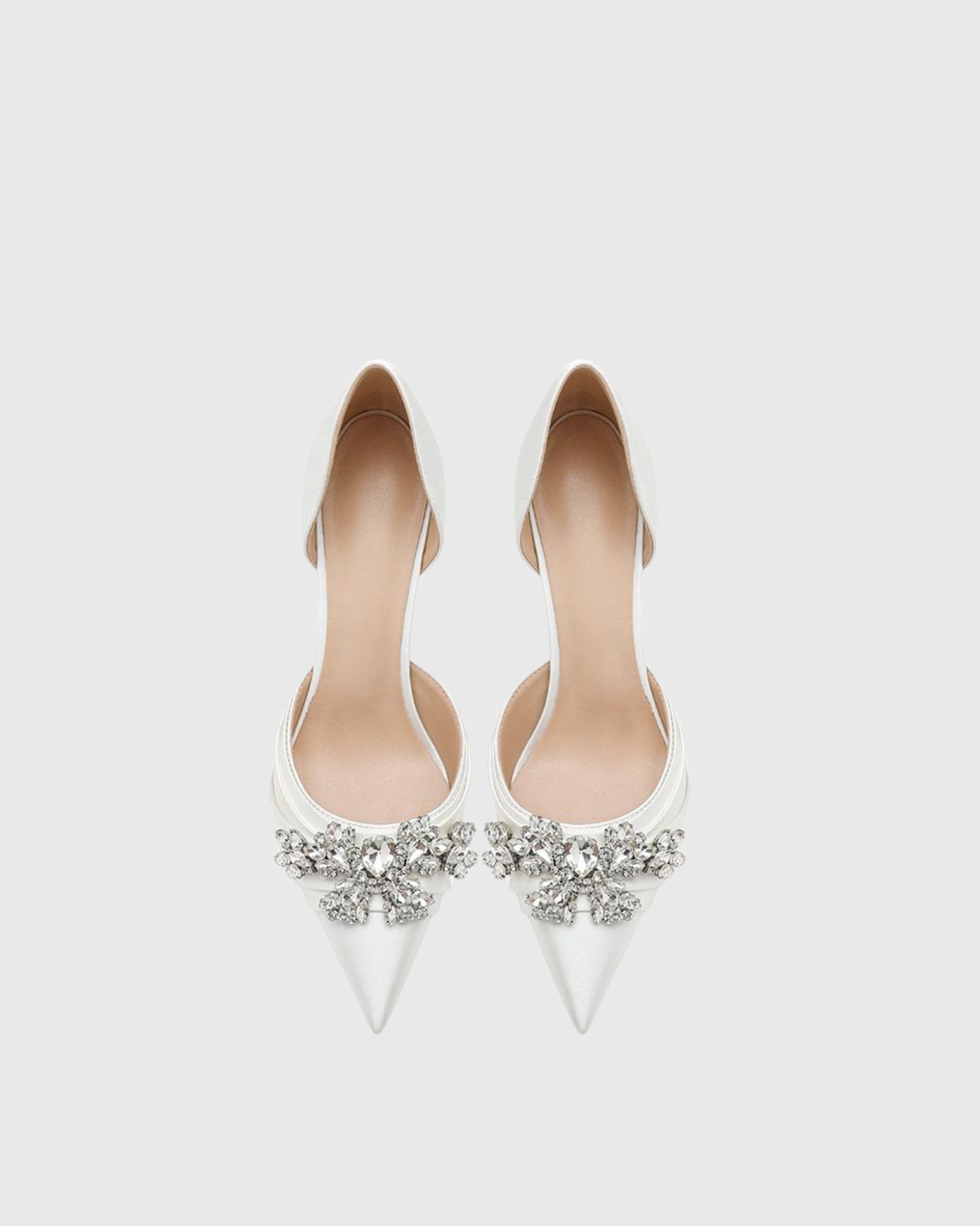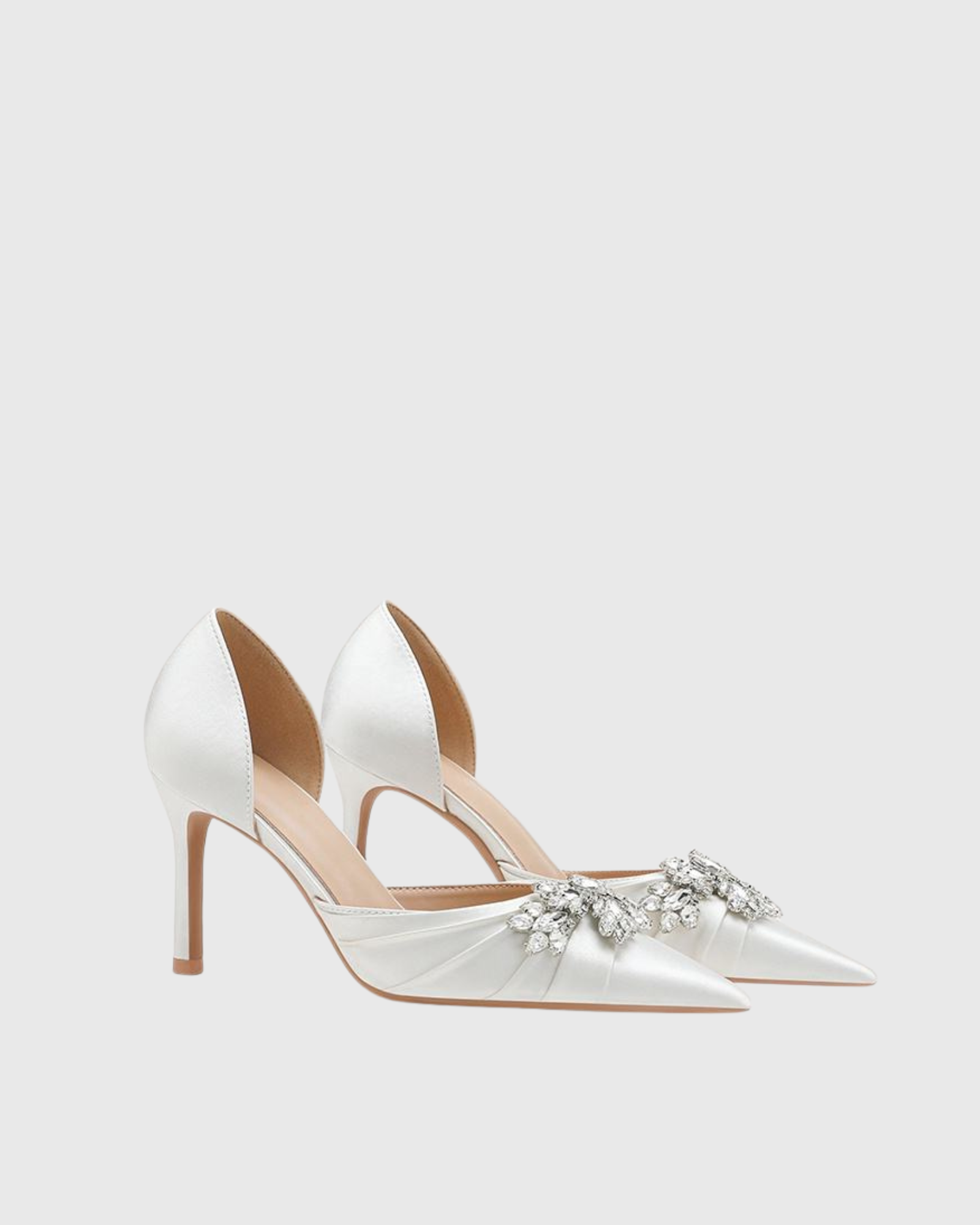 Step into elegance with the Dada Rhinestone Vine D'Orsay Pumps. Featuring a delicate vine of shimmering rhinestones, these pumps add a sparkling touch to any outfit. The graceful D'Orsay cut enhances your silhouette while offering a comfortable fit for all-day wear. Perfect for special events or elevating everyday style, these shoes combine glamour and sophistication effortlessly.