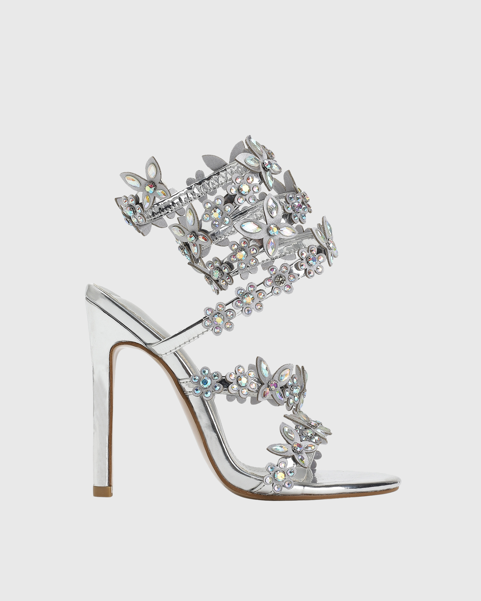 Elisa Rhinestone Butterfly Embellished Snake Sandals In Silver