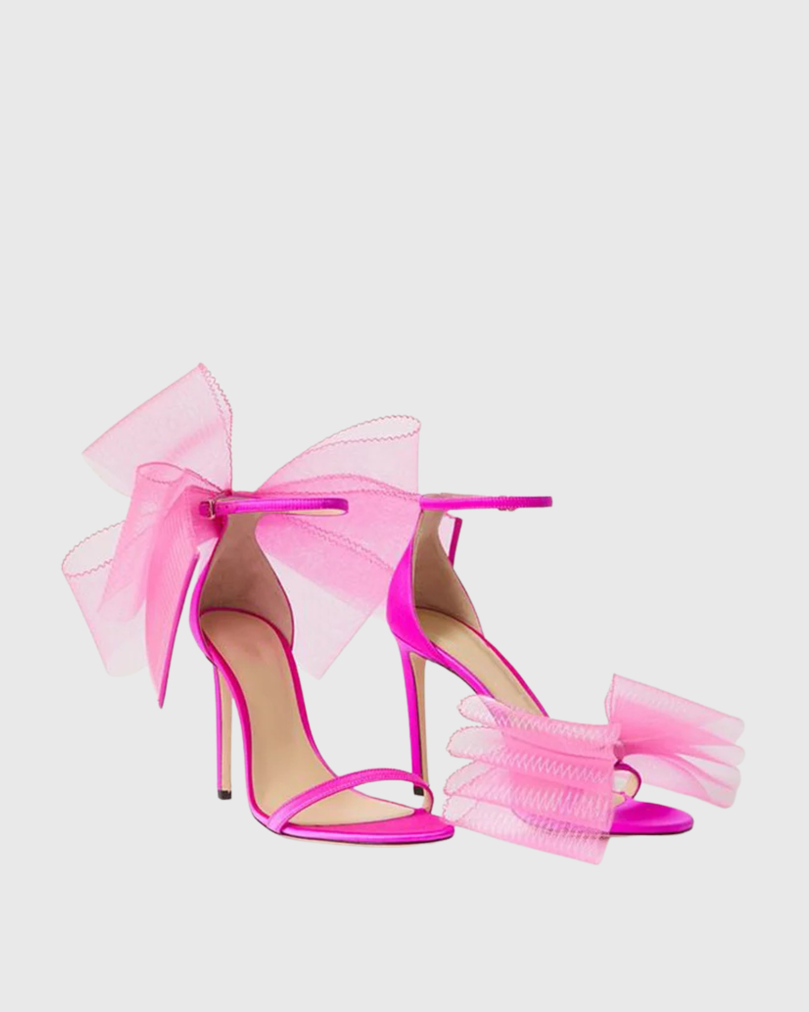Step into vibrant elegance with the Fabrizia Mesh Bow Satin Sandals in Hot Pink. These sandals combine delicate mesh and luxurious satin, accented by a charming bow that adds a playful yet sophisticated touch. Perfect for making a bold statement at any event, they offer both style and comfort to elevate your look effortlessly.