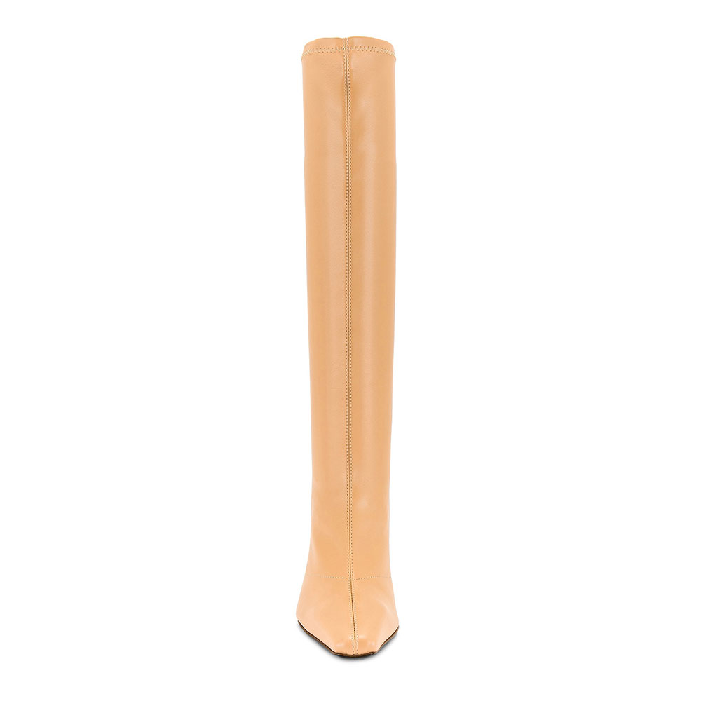 Step out in style with FSJ's Tan Square Toe Flared Heel Pull-On Knee High Boots for Women. Elevate your look with these trendy boots.