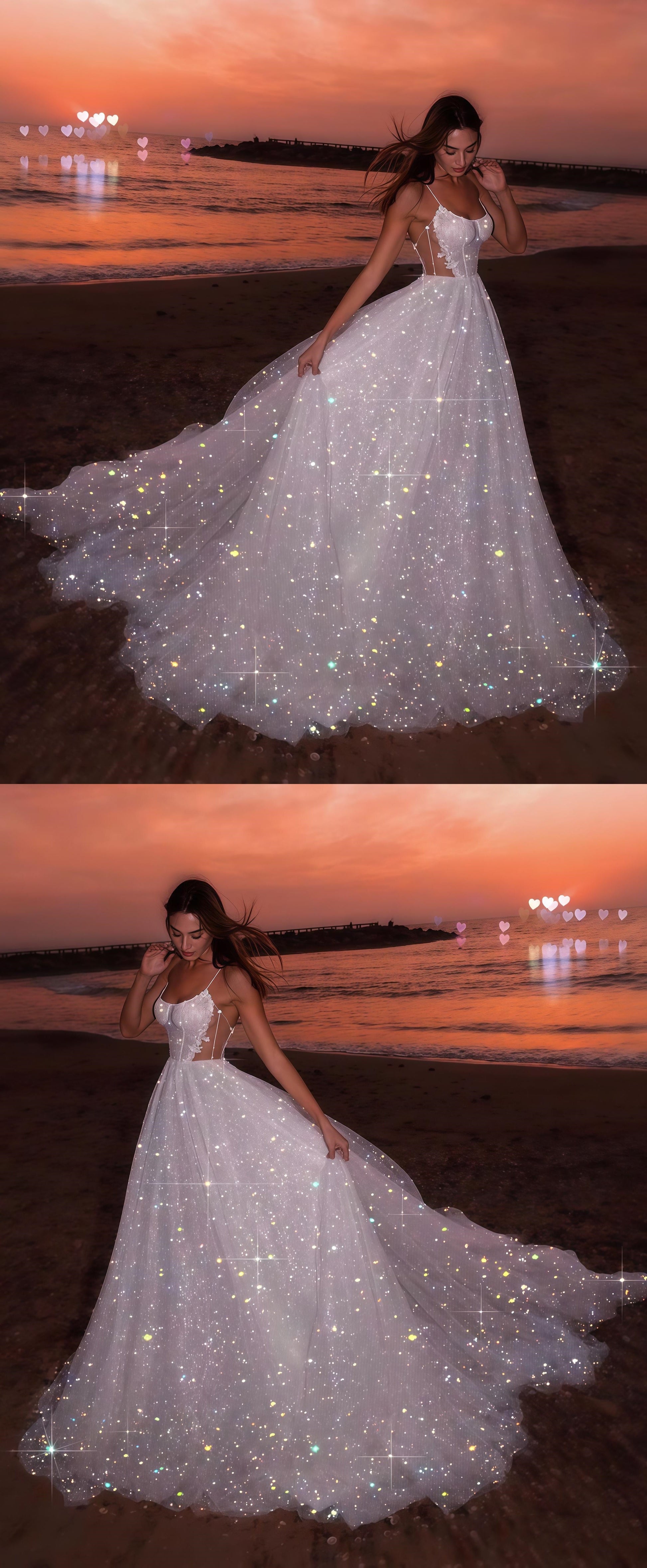 Glitter White Sequin Tulle Party Dresses, A-line Sleeveless Beach Wedding Gown
