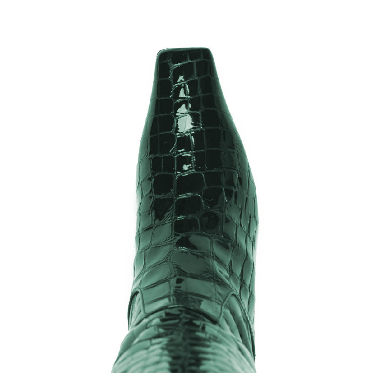 Green Crocodile Embossed Square Toe Low Heel Knee High Boots for Women