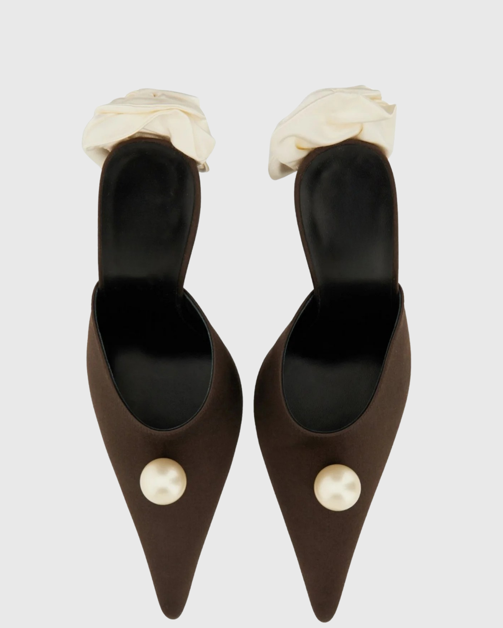 Isotta Flower Embellished Pearl Satin Mules In Brown