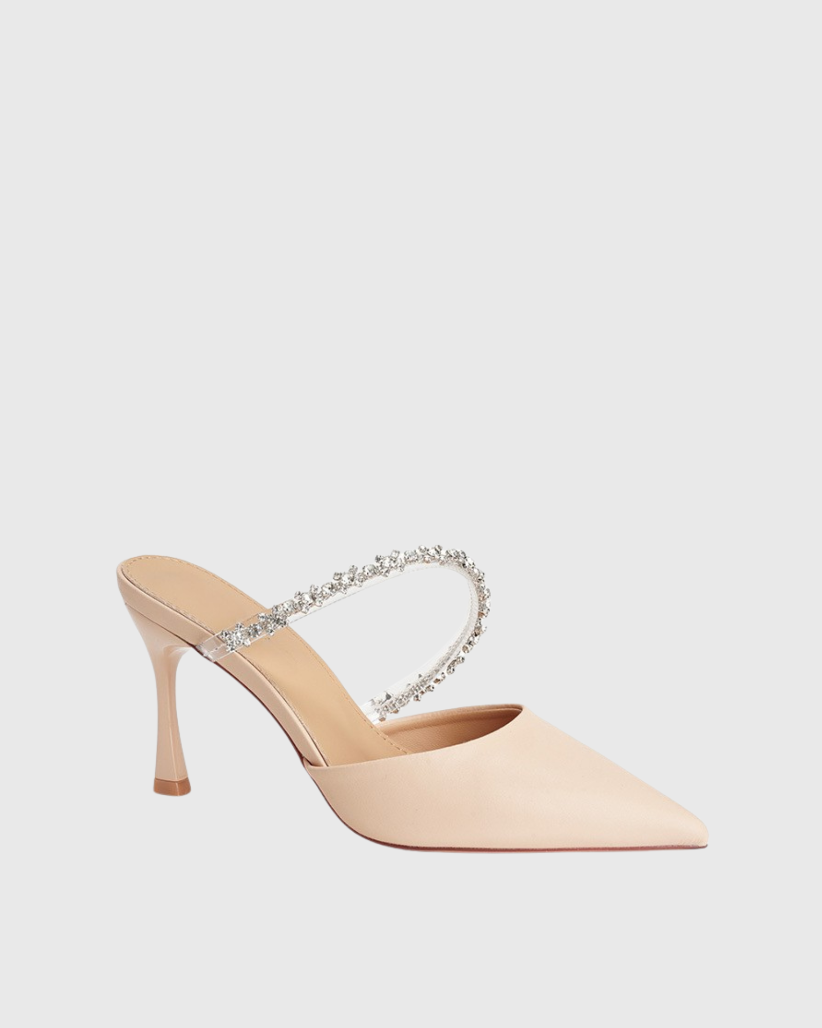 Step into elegance with the Nerina Rhinestone Mules in Beige. These chic mules combine a soft beige hue with sparkling rhinestone accents, offering a perfect balance of subtlety and glamour. Designed for comfort and style, they effortlessly elevate any outfit, making them ideal for both casual days and sophisticated evenings. Add a touch of refined shine to your wardrobe with these versatile statement shoes.