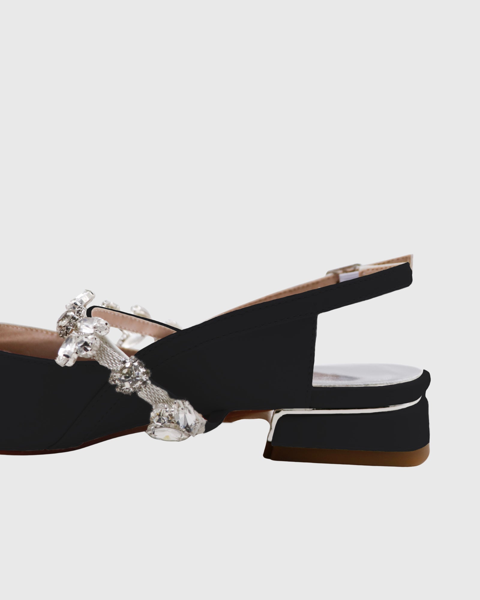Elevate your style with the Nerina Rhinestone Strap Satin Flats in Black. These elegant flats combine luxurious satin with sparkling rhinestone straps, adding a touch of glamour to any outfit. Perfect for both day and evening wear, they offer comfort without compromising on sophistication. Step out confidently and make a lasting impression wherever you go.