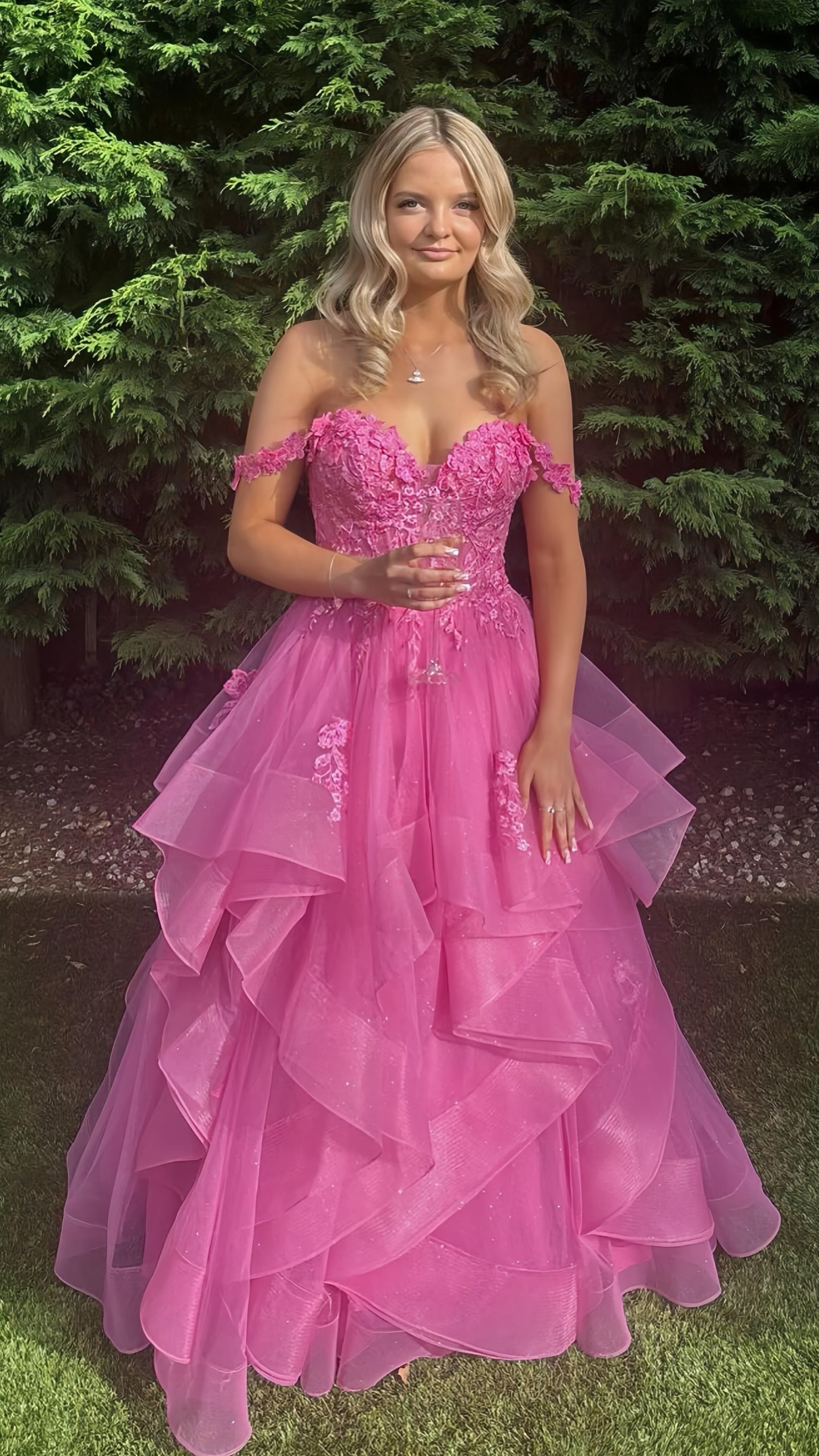 Off The Shoulder Pink Appliques Ball Gown Tulle Prom Dress