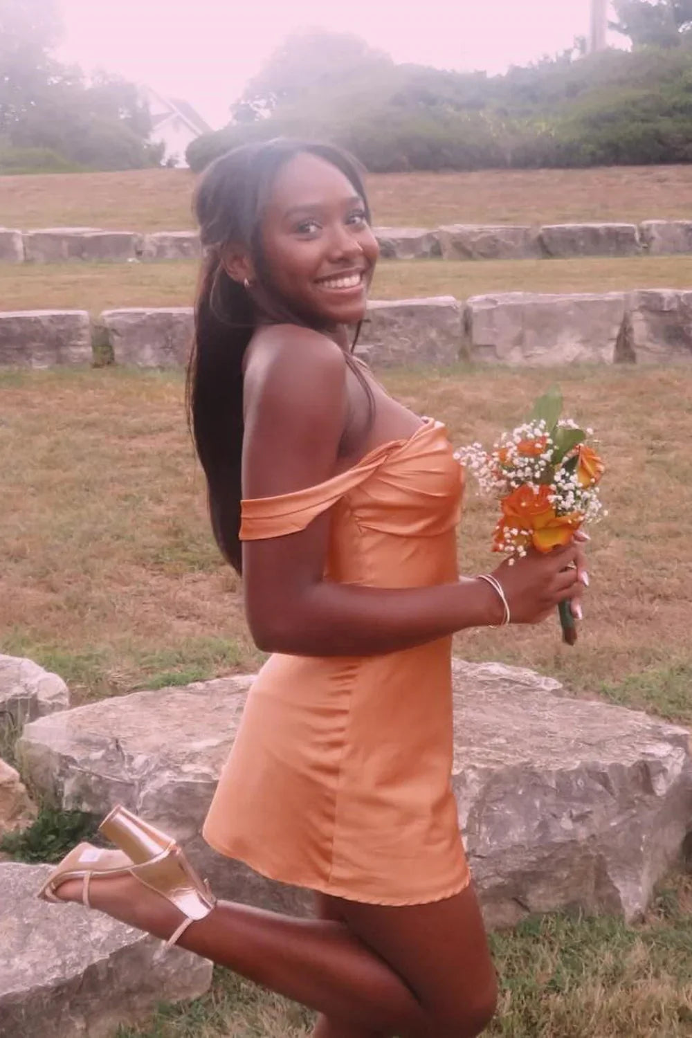 Elevate your look with this Off The Shoulder Satin Tight Short Dress. Perfect for senior homecoming, this dress features a flattering off-shoulder neckline and a figure-hugging satin material. Embrace a sophisticated and elegant style while feeling comfortable and confident. Make a statement in this senior homecoming dress.