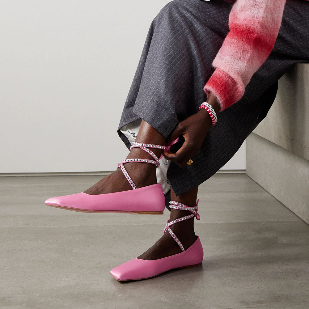 Pink Satin Square Toe Wedding Shoes Rhinestone Strappy Ballet Flats