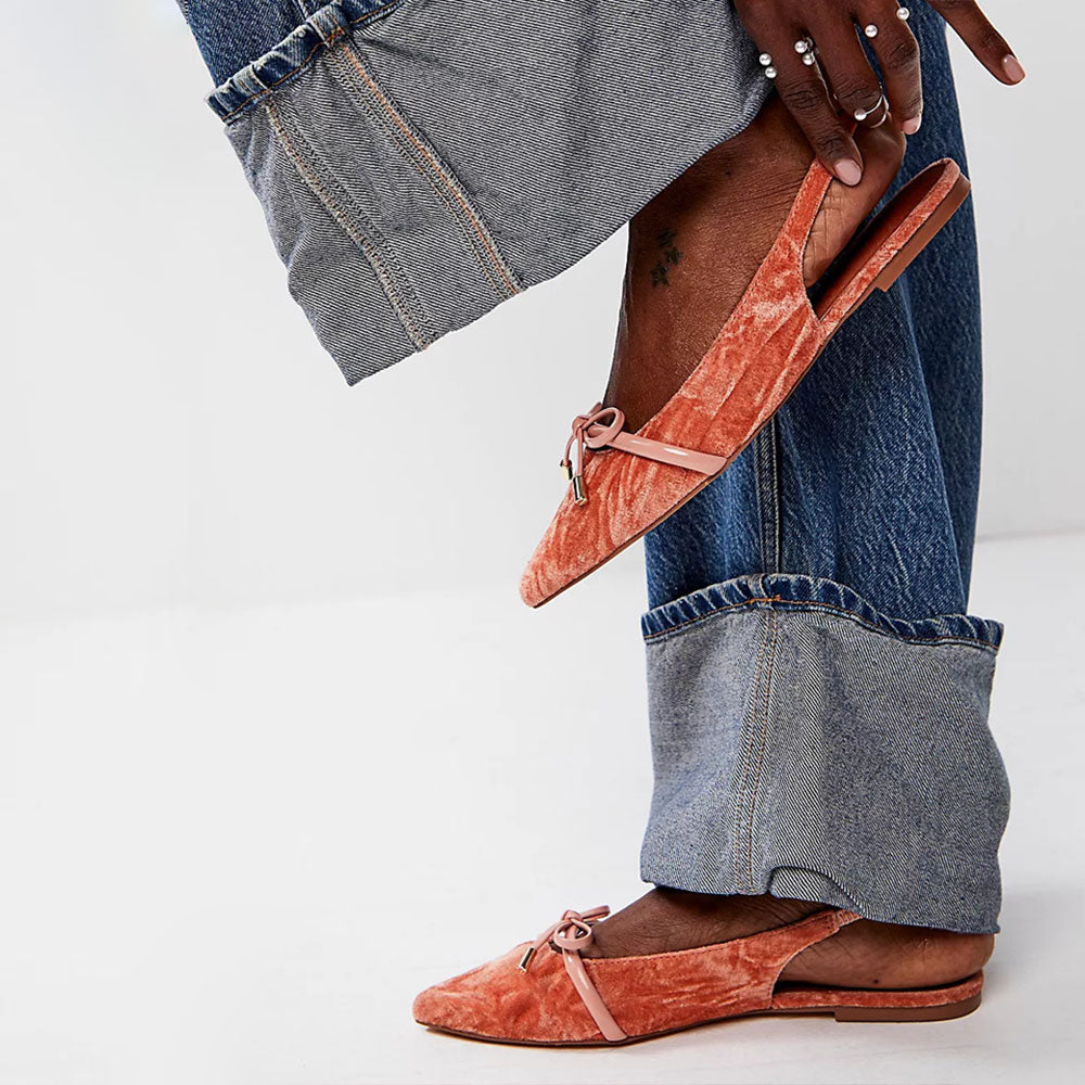 Pink Velvet Pointed Toe Bow Strap Slingback Flats