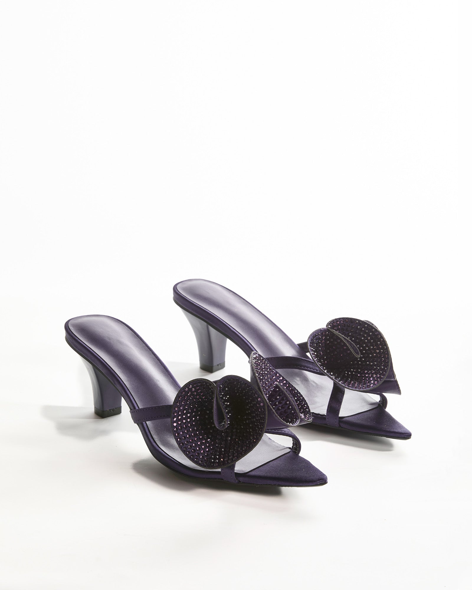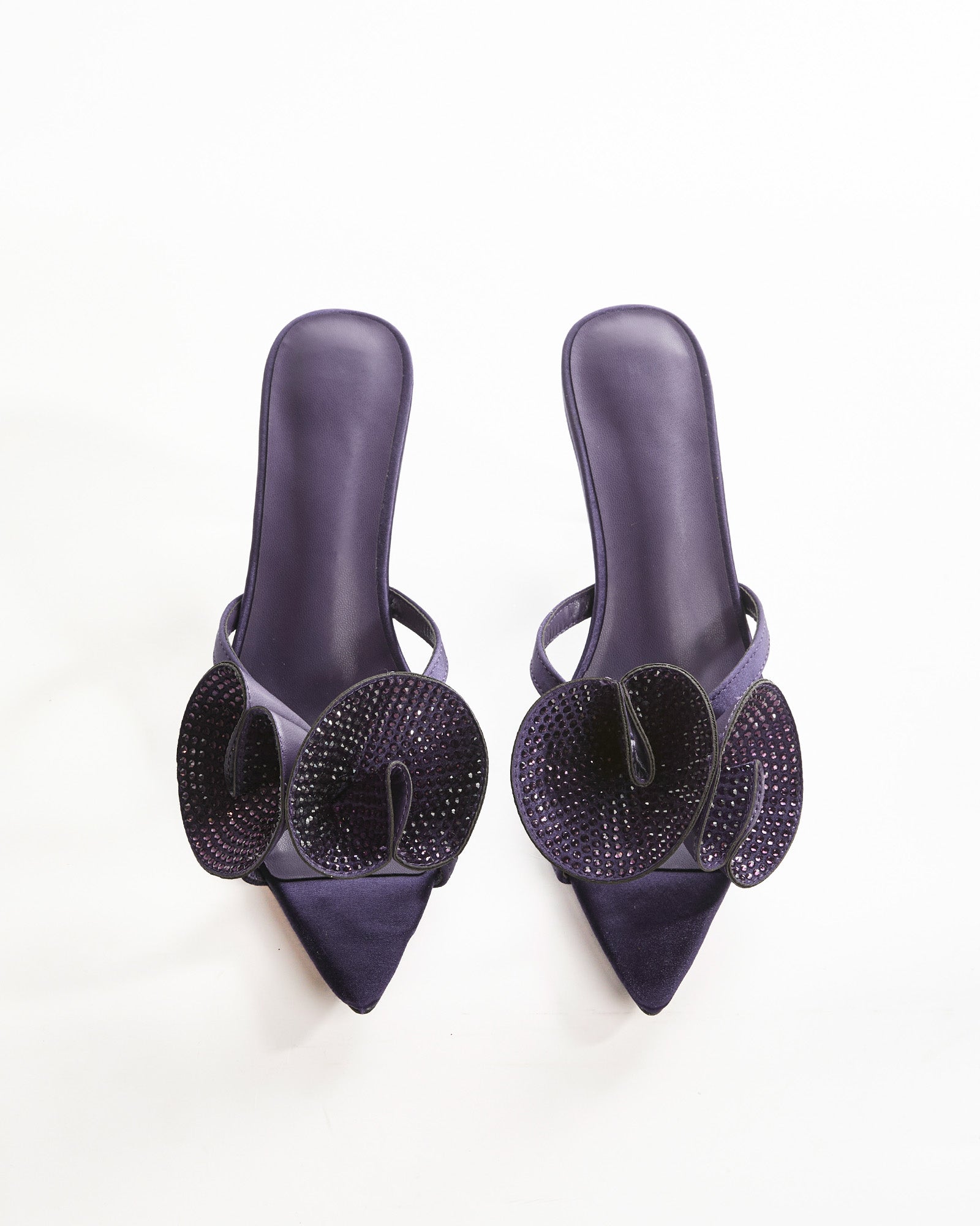 Step into elegance with the Roberta Rhinestone Flower Slippers in Purple. These stunning slippers feature sparkling rhinestone embellishments and delicate flower details that add a touch of glamour to any outfit. Crafted for comfort and style, they are perfect for lounging at home or making a statement at your next event. Elevate your footwear collection with these eye-catching slippers that blend luxury with everyday ease.